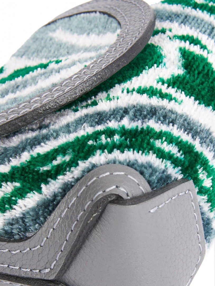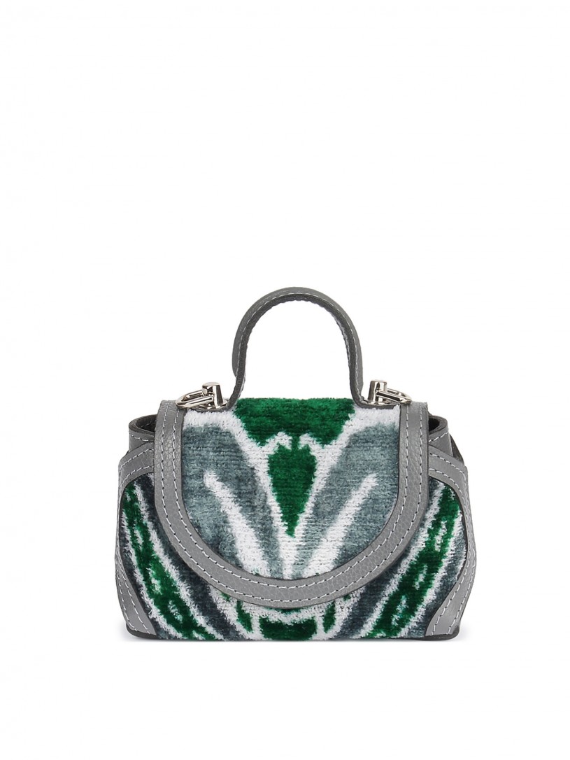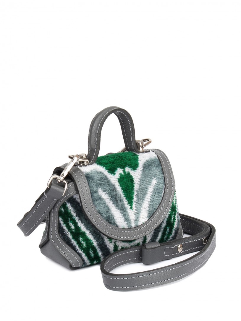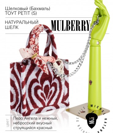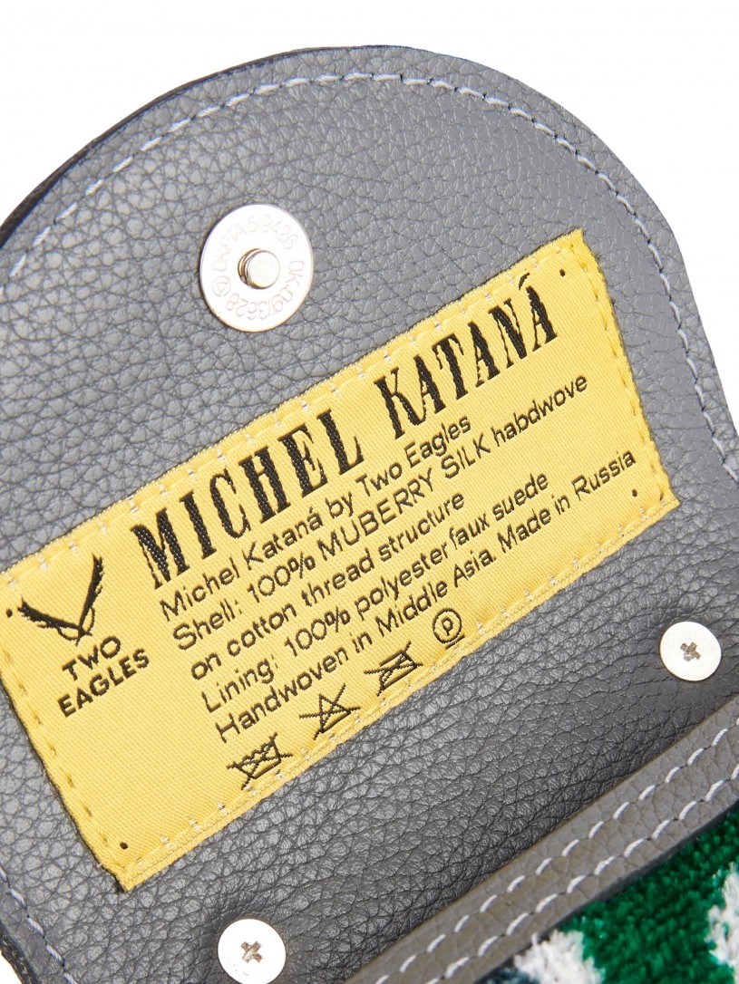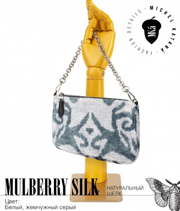 Натуральный шелк, сотканная вручную по традиционной и аутентичной технологии ручного ткачества в Ферганской долине Узбекистана (Маргилан) ткань Бахмаль. Из нитей шелка окрашенных также вручную натуральными красителями. Ткут ее именно крафтово, в домашних условиях на традиционных крафтовых ткацких станках. Нити шелка вотканы в структуру из нитей хлопка, в весовых пропорциях приблизительно 80/20% Шелк/Хлопок. Ткань невероятно долговечна, красива, мягка, и в то же время прочна... по сути "неубиваемая" ткань. Именно на перекрестке этого традиционного характерного, и эстетики дизайнерского восприятия от Michel Kataná и появилась эта коллекция сумок и аксессуаров к ним, на дальнейший пошив которых уходит еще не менее 72 часов работы мастеров для каждой.