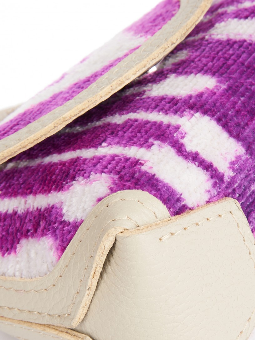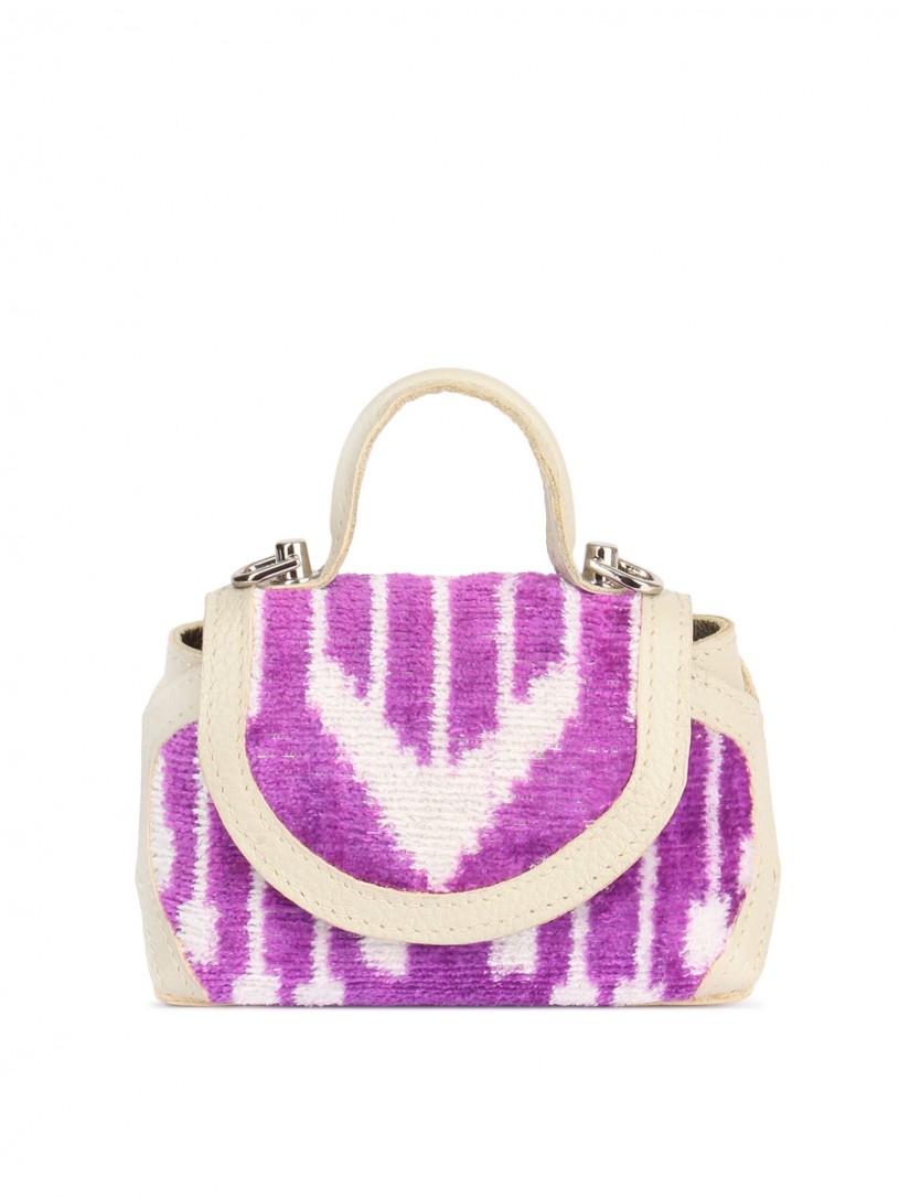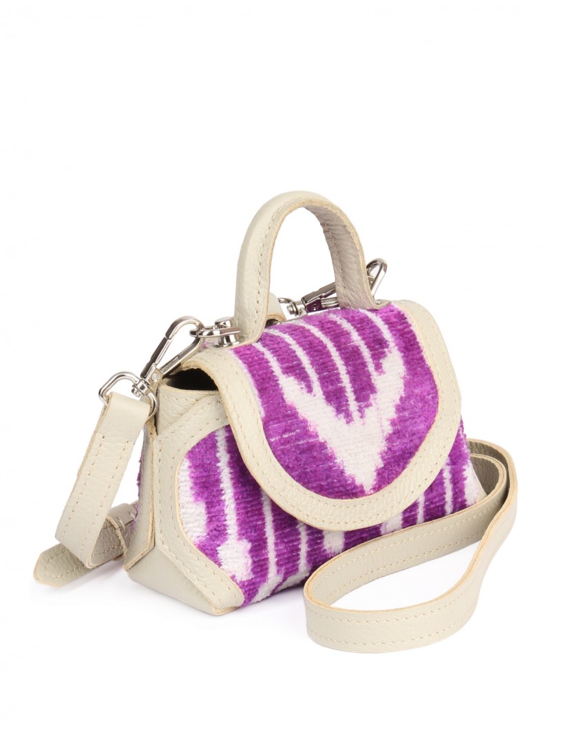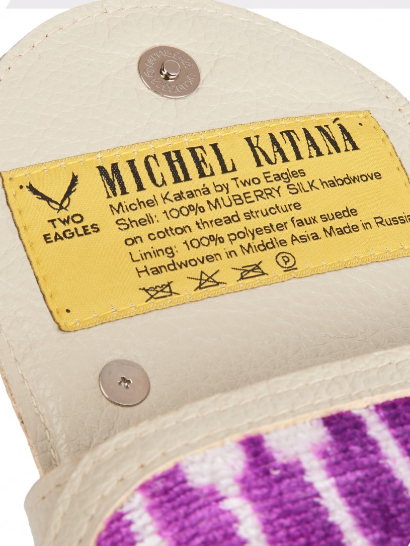 Натуральный шелк, сотканная вручную по традиционной и аутентичной технологии ручного ткачества в Ферганской долине Узбекистана (Маргилан) ткань Бахмаль. Из нитей шелка окрашенных также вручную натуральными красителями. Ткут ее именно крафтово, в домашних условиях на традиционных крафтовых ткацких станках. Нити шелка вотканы в структуру из нитей хлопка, в весовых пропорциях приблизительно 80/20% Шелк/Хлопок. Ткань невероятно долговечна, красива, мягка, и в то же время прочна... по сути "неубиваемая" ткань. Именно на перекрестке этого традиционного характерного, и эстетики дизайнерского восприятия от Michel Kataná и появилась эта коллекция сумок и аксессуаров к ним, на дальнейший пошив которых уходит еще не менее 72 часов работы мастеров для каждой.