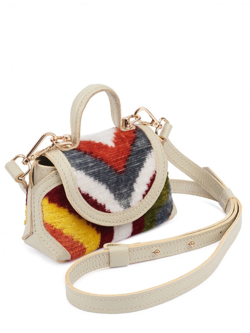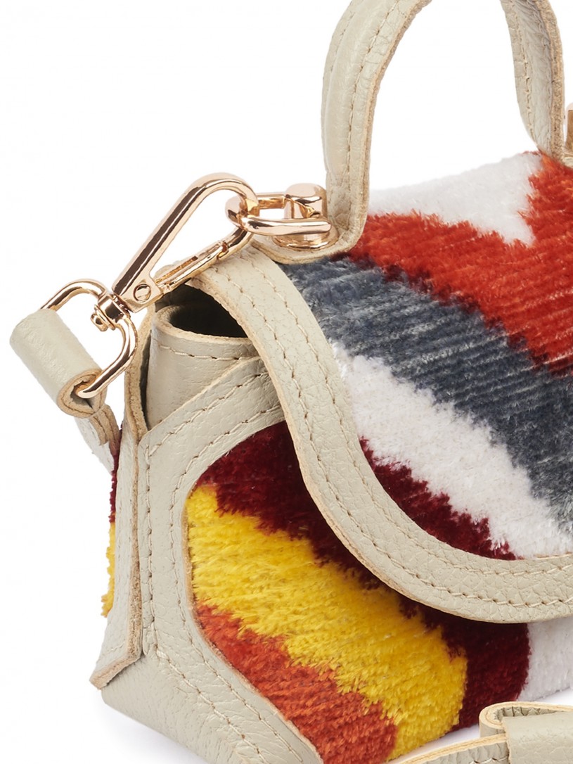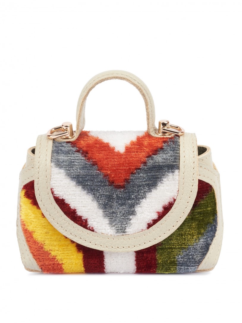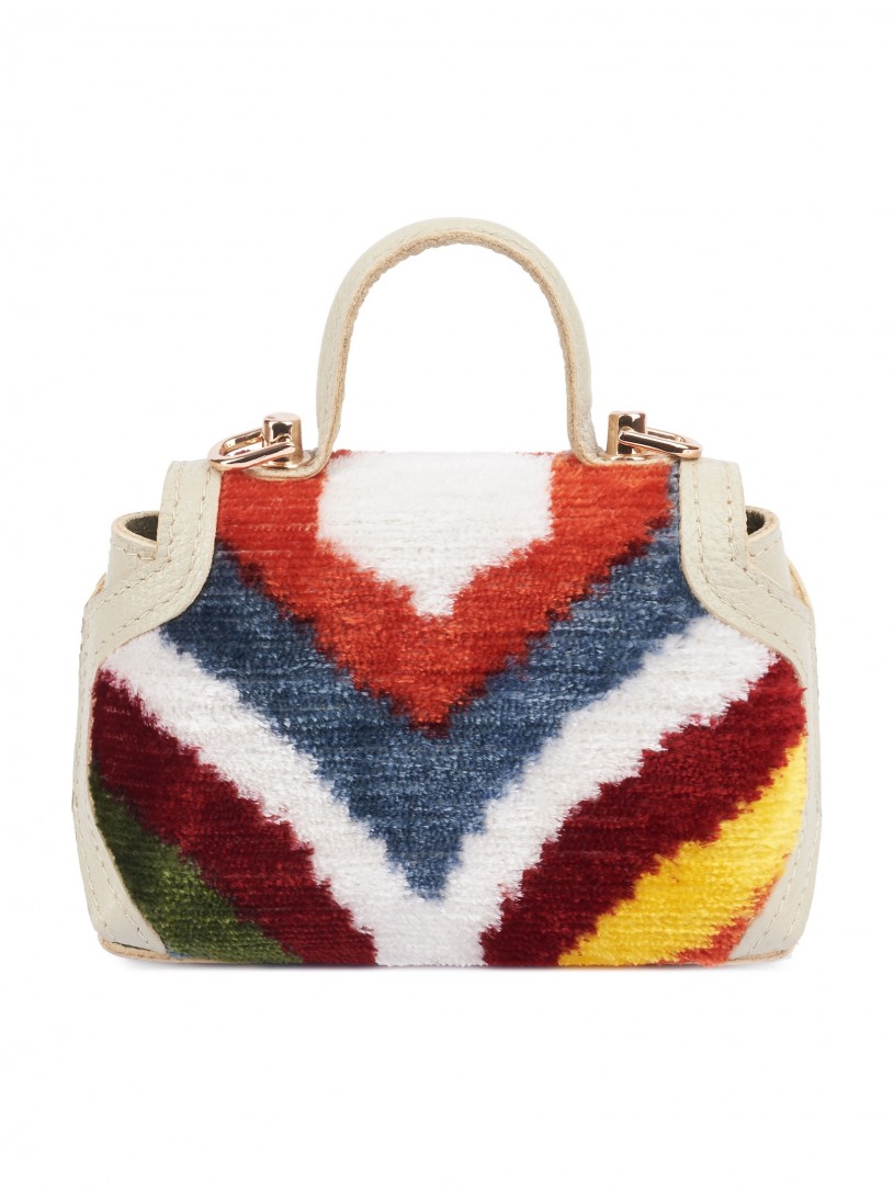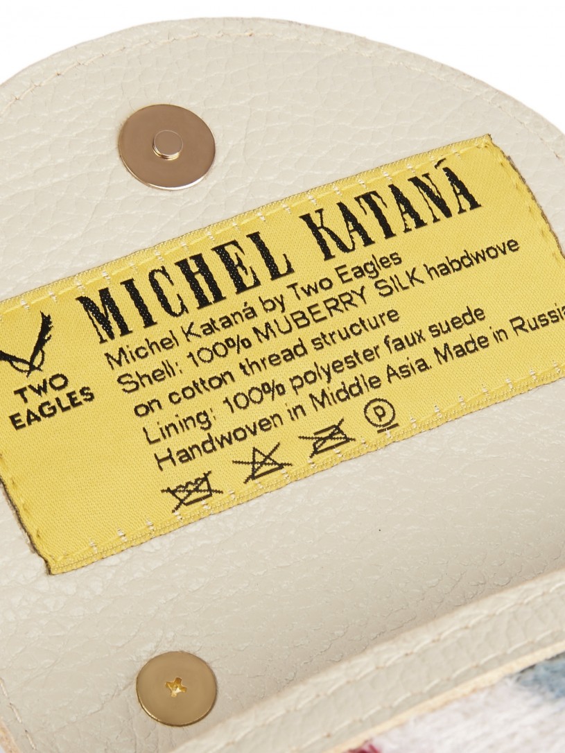 Натуральный шелк, сотканная вручную по традиционной и аутентичной технологии ручного ткачества в Ферганской долине Узбекистана (Маргилан) ткань Бахмаль. Из нитей шелка окрашенных также вручную натуральными красителями. Ткут ее именно крафтово, в домашних условиях на традиционных крафтовых ткацких станках. Нити шелка вотканы в структуру из нитей хлопка, в весовых пропорциях приблизительно 80/20% Шелк/Хлопок. Ткань невероятно долговечна, красива, мягка, и в то же время прочна... по сути "неубиваемая" ткань. Именно на перекрестке этого традиционного характерного, и эстетики дизайнерского восприятия от Michel Kataná и появилась эта коллекция сумок и аксессуаров к ним, на дальнейший пошив которых уходит еще не менее 72 часов работы мастеров для каждой.