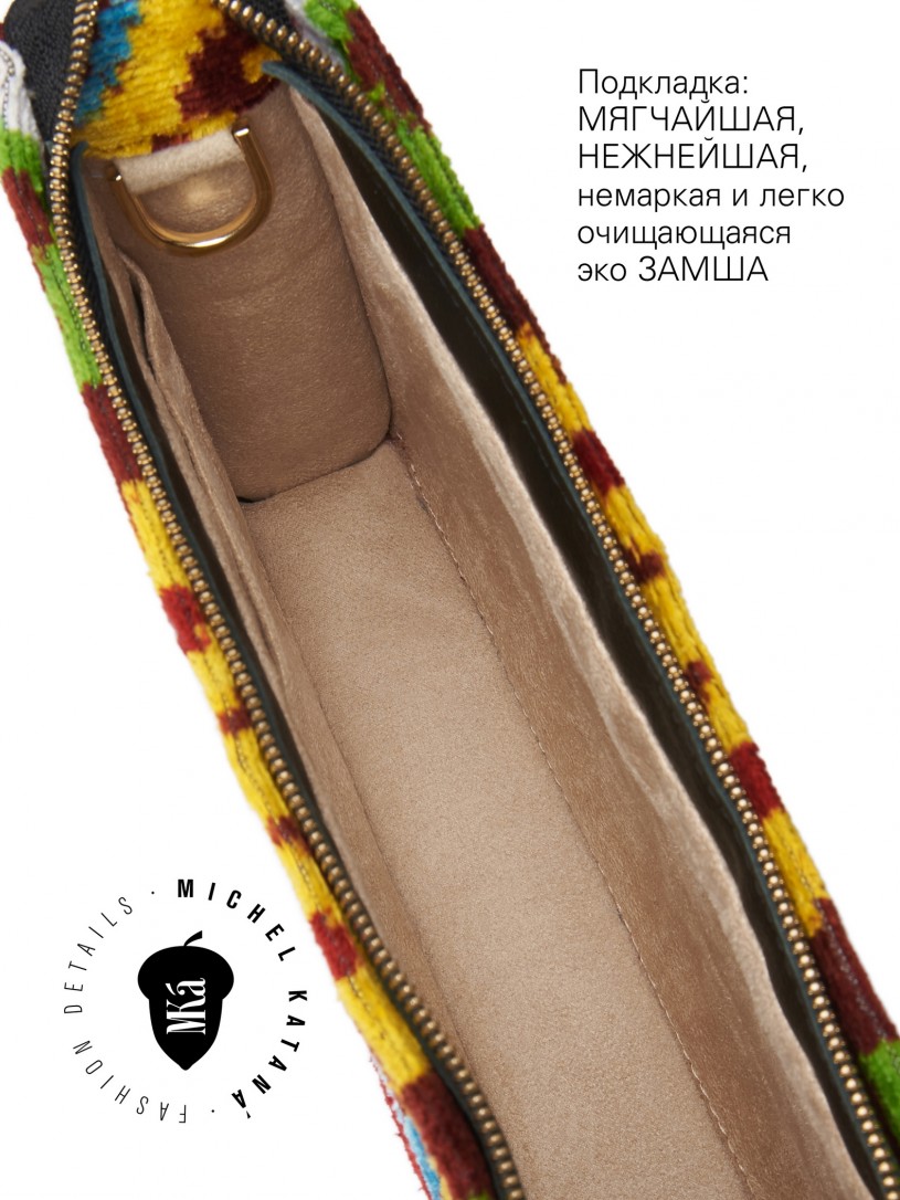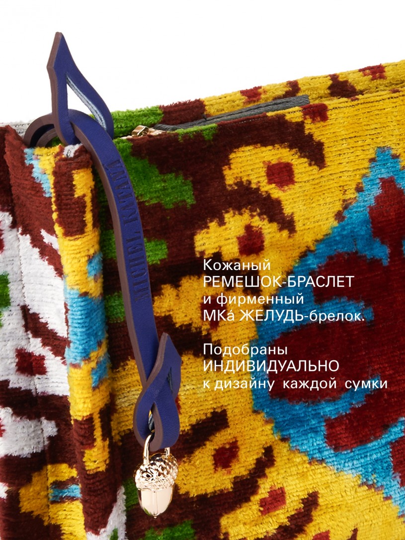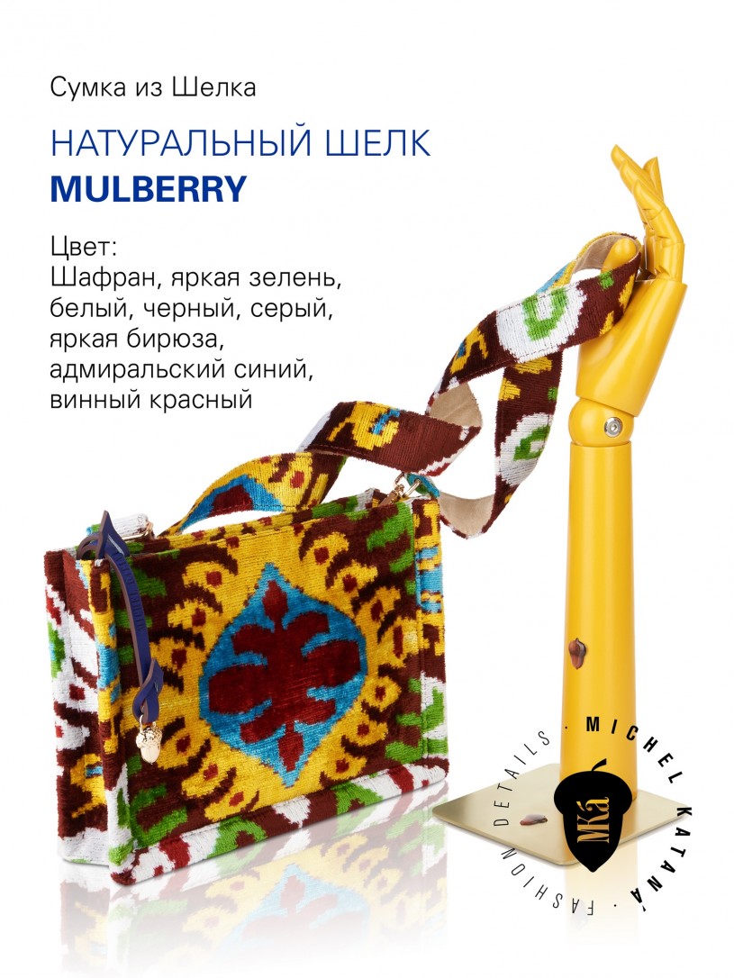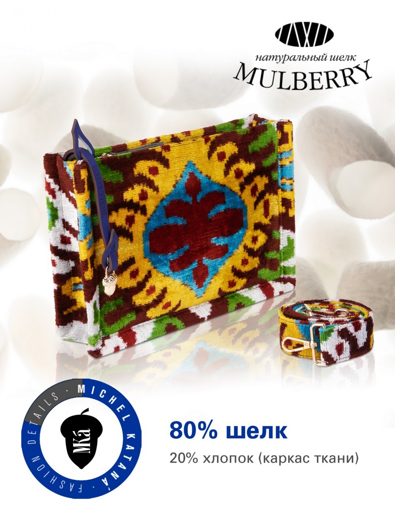 Натуральный шелк, сотканная вручную по традиционной и аутентичной технологии ручного ткачества в Ферганской долине Узбекистана (Маргилан) ткань Бахмаль. Из нитей шелка окрашенных также вручную натуральными красителями. Ткут ее именно крафтово, в домашних условиях на традиционных крафтовых ткацких станках. Нити шелка вотканы в структуру из нитей хлопка, в весовых пропорциях приблизительно 80/20% Шелк/Хлопок. Ткань невероятно долговечна, красива, мягка, и в то же время прочна... по сути "неубиваемая" ткань. Именно на перекрестке этого традиционного характерного, и эстетики дизайнерского восприятия от Michel Kataná и появилась эта коллекция сумок и аксессуаров к ним, на дальнейший пошив которых уходит еще не менее 72 часов работы мастеров для каждой.