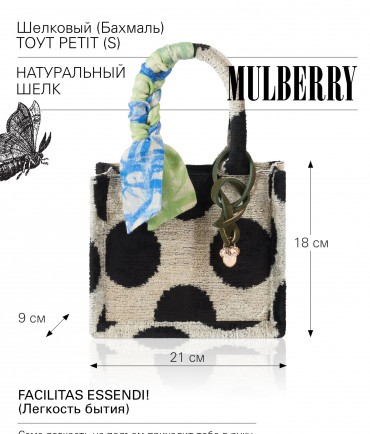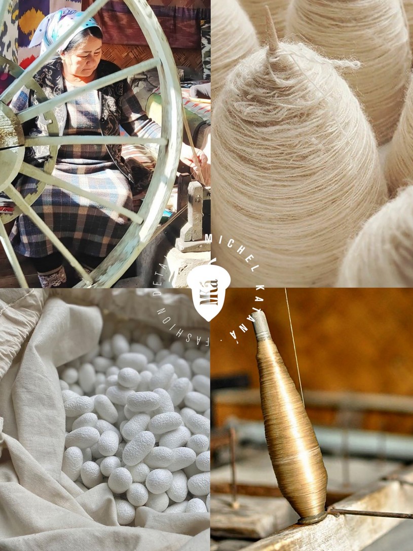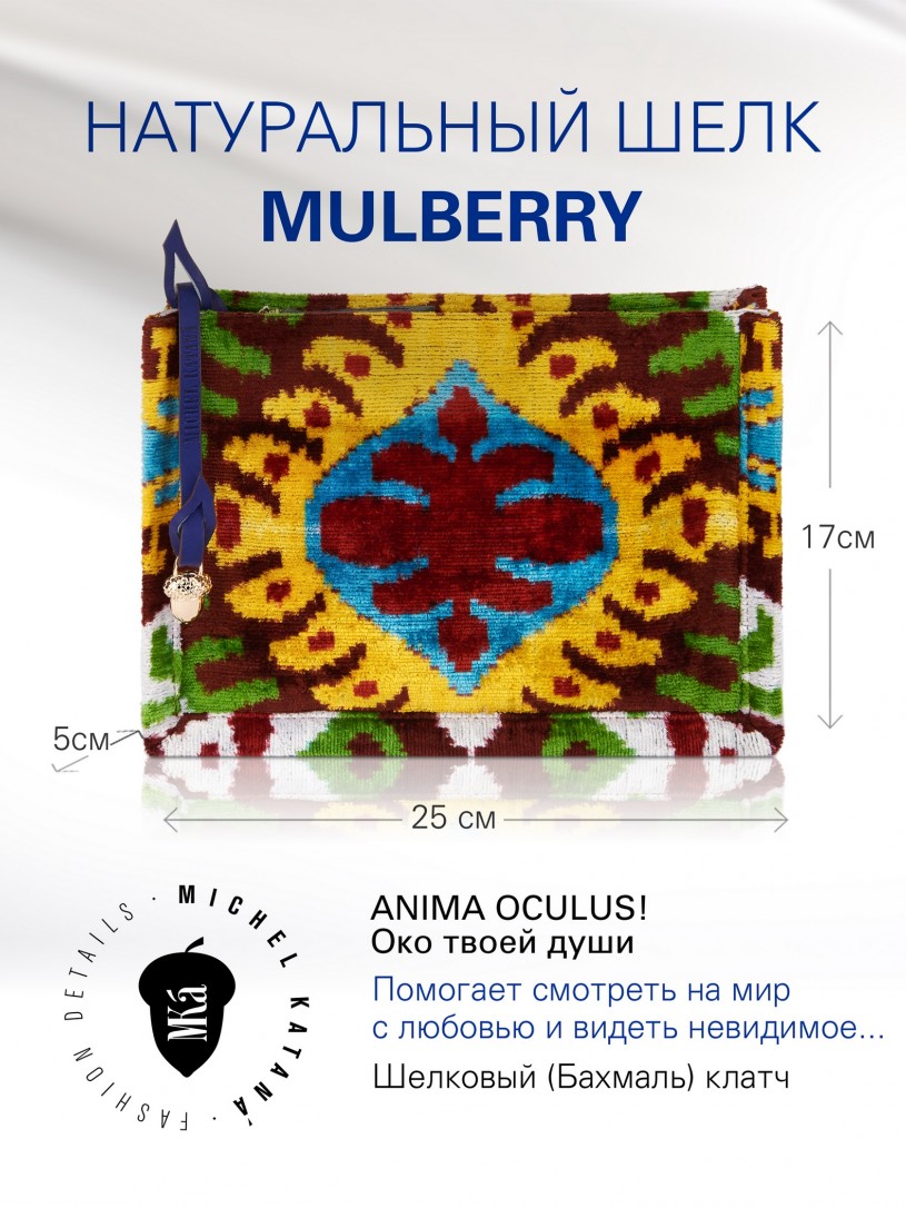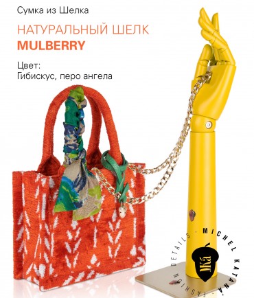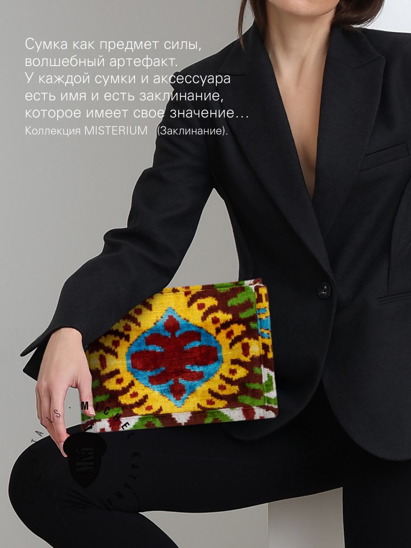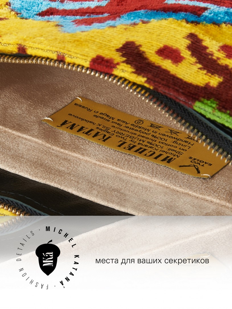 Натуральный шелк, сотканная вручную по традиционной и аутентичной технологии ручного ткачества в Ферганской долине Узбекистана (Маргилан) ткань Бахмаль. Из нитей шелка окрашенных также вручную натуральными красителями. Ткут ее именно крафтово, в домашних условиях на традиционных крафтовых ткацких станках. Нити шелка вотканы в структуру из нитей хлопка, в весовых пропорциях приблизительно 80/20% Шелк/Хлопок. Ткань невероятно долговечна, красива, мягка, и в то же время прочна... по сути "неубиваемая" ткань. Именно на перекрестке этого традиционного характерного, и эстетики дизайнерского восприятия от Michel Kataná и появилась эта коллекция сумок и аксессуаров к ним, на дальнейший пошив которых уходит еще не менее 72 часов работы мастеров для каждой.