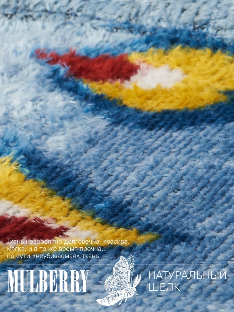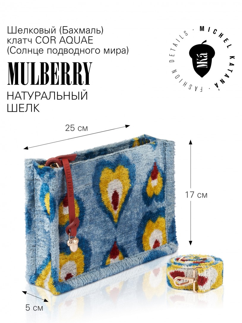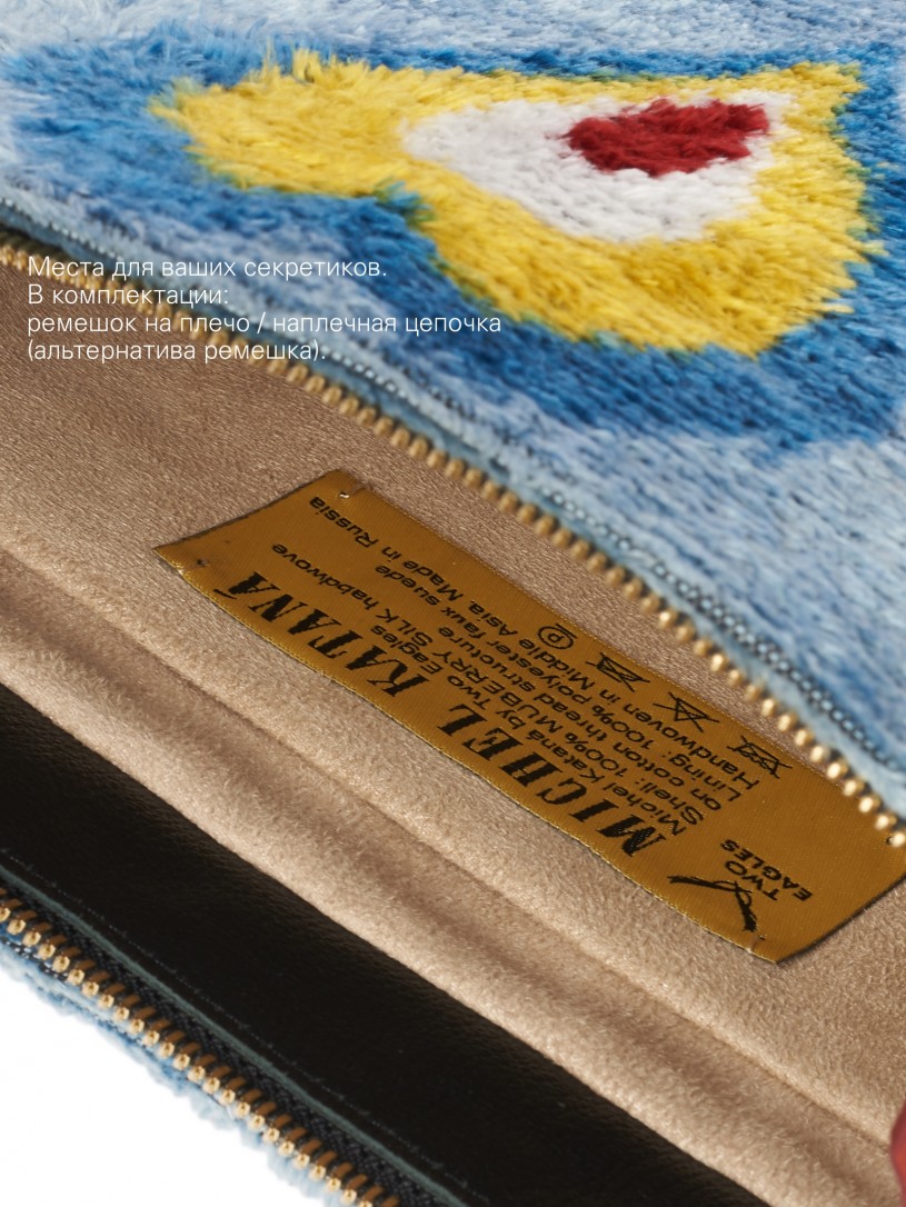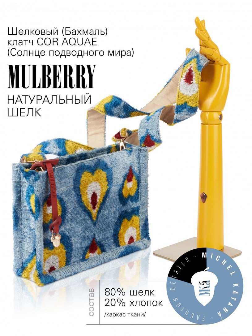 Натуральный шелк, сотканная вручную по традиционной и аутентичной технологии ручного ткачества в Ферганской долине Узбекистана (Маргилан) ткань Бахмаль. Из нитей шелка окрашенных также вручную натуральными красителями. Ткут ее именно крафтово, в домашних условиях на традиционных крафтовых ткацких станках. Нити шелка вотканы в структуру из нитей хлопка, в весовых пропорциях приблизительно 80/20% Шелк/Хлопок. Ткань невероятно долговечна, красива, мягка, и в то же время прочна... по сути "неубиваемая" ткань. Именно на перекрестке этого традиционного характерного, и эстетики дизайнерского восприятия от Michel Kataná и появилась эта коллекция сумок и аксессуаров к ним, на дальнейший пошив которых уходит еще не менее 72 часов работы мастеров для каждой.