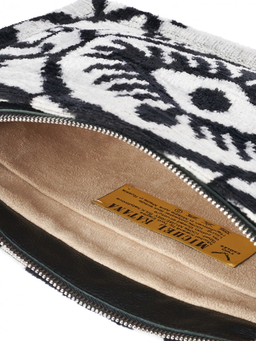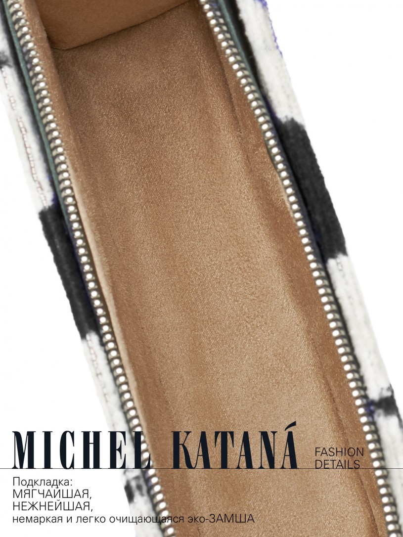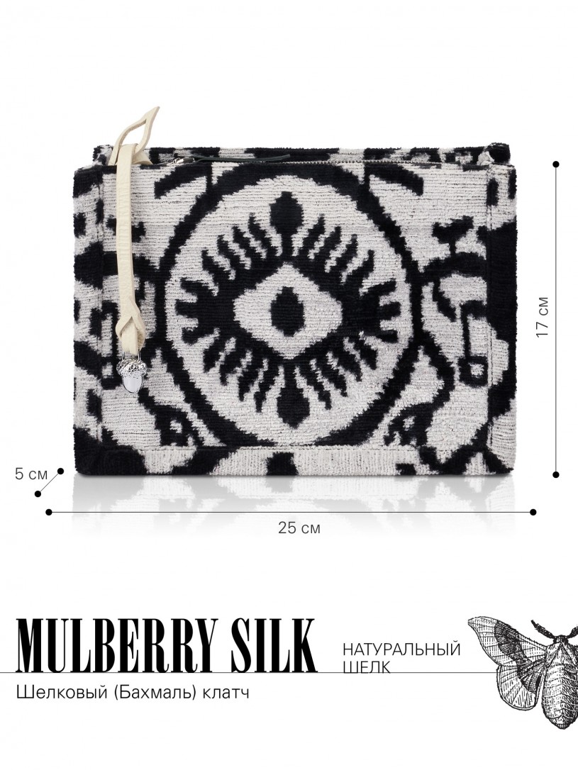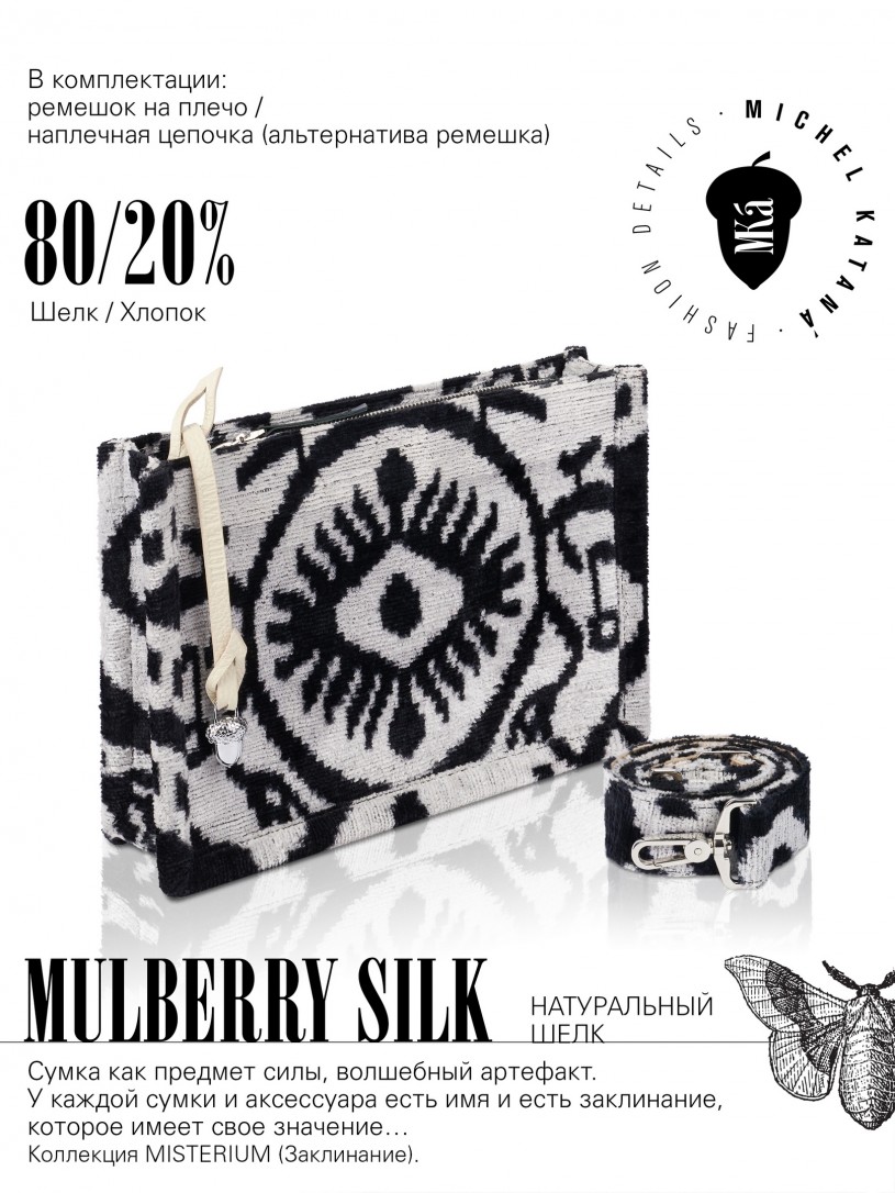 Натуральный шелк, сотканная вручную по традиционной и аутентичной технологии ручного ткачества в Ферганской долине Узбекистана (Маргилан) ткань Бахмаль. Из нитей шелка окрашенных также вручную натуральными красителями. Ткут ее именно крафтово, в домашних условиях на традиционных крафтовых ткацких станках. Нити шелка вотканы в структуру из нитей хлопка, в весовых пропорциях приблизительно 80/20% Шелк/Хлопок. Ткань невероятно долговечна, красива, мягка, и в то же время прочна... по сути "неубиваемая" ткань. Именно на перекрестке этого традиционного характерного, и эстетики дизайнерского восприятия от Michel Kataná и появилась эта коллекция сумок и аксессуаров к ним, на дальнейший пошив которых уходит еще не менее 72 часов работы мастеров для каждой.