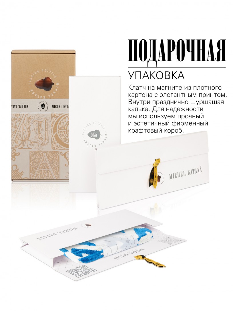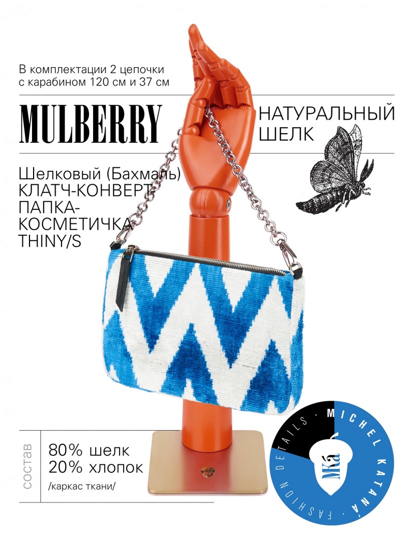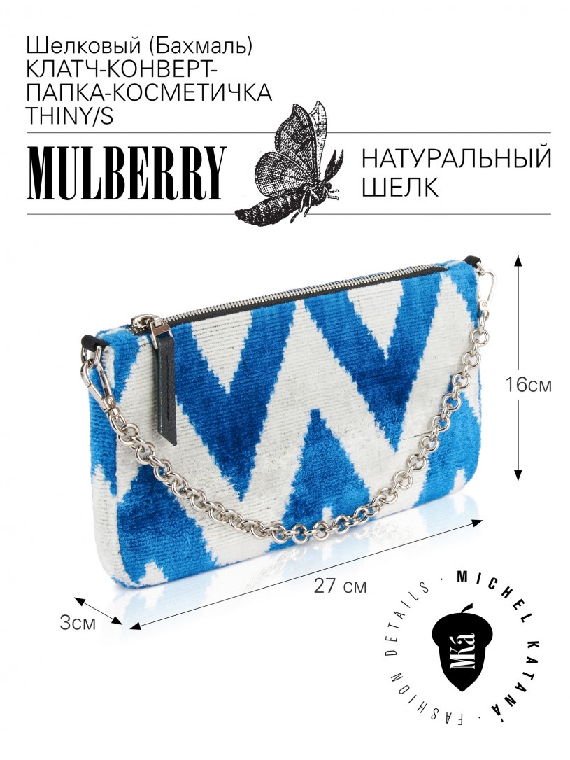 Натуральный шелк, сотканная вручную по традиционной и аутентичной технологии ручного ткачества в Ферганской долине Узбекистана (Маргилан) ткань Бахмаль. Из нитей шелка окрашенных также вручную натуральными красителями. Ткут ее именно крафтово, в домашних условиях на традиционных крафтовых ткацких станках. Нити шелка вотканы в структуру из нитей хлопка, в весовых пропорциях приблизительно 80/20% Шелк/Хлопок. Ткань невероятно долговечна, красива, мягка, и в то же время прочна... по сути "неубиваемая" ткань. Именно на перекрестке этого традиционного характерного, и эстетики дизайнерского восприятия от Michel Kataná и появилась эта коллекция сумок и аксессуаров к ним, на дальнейший пошив которых уходит еще не менее 72 часов работы мастеров для каждой.