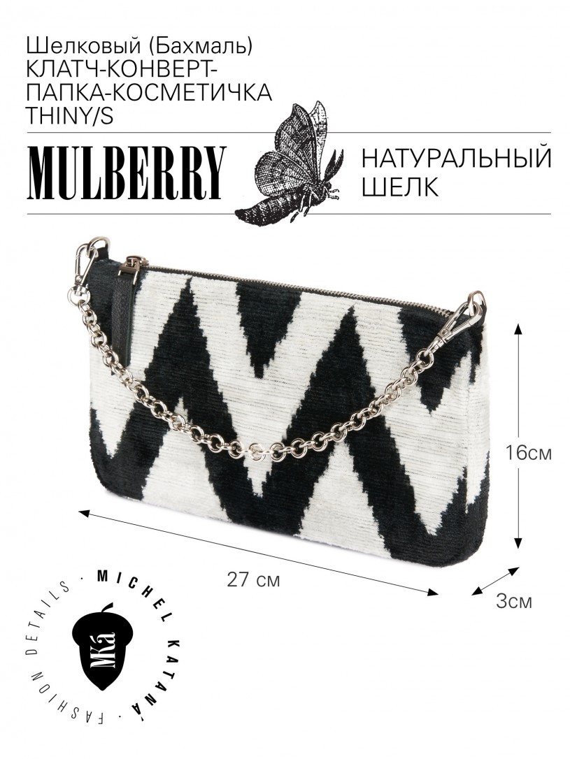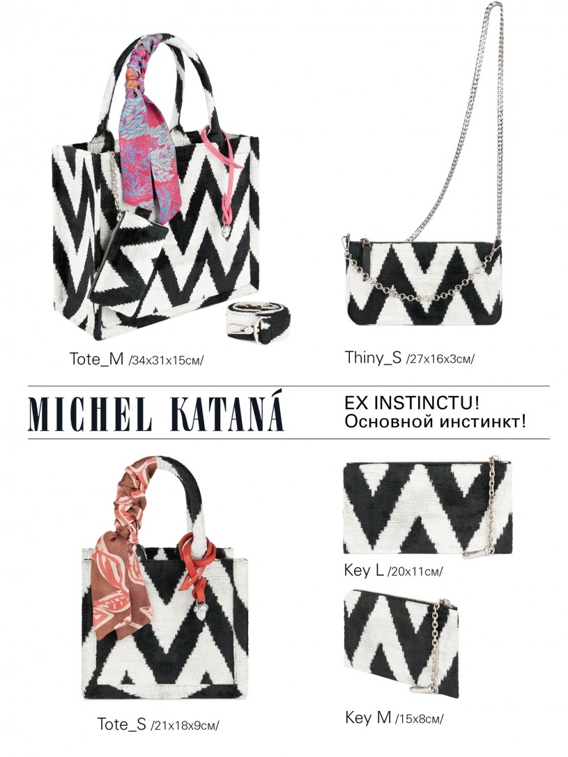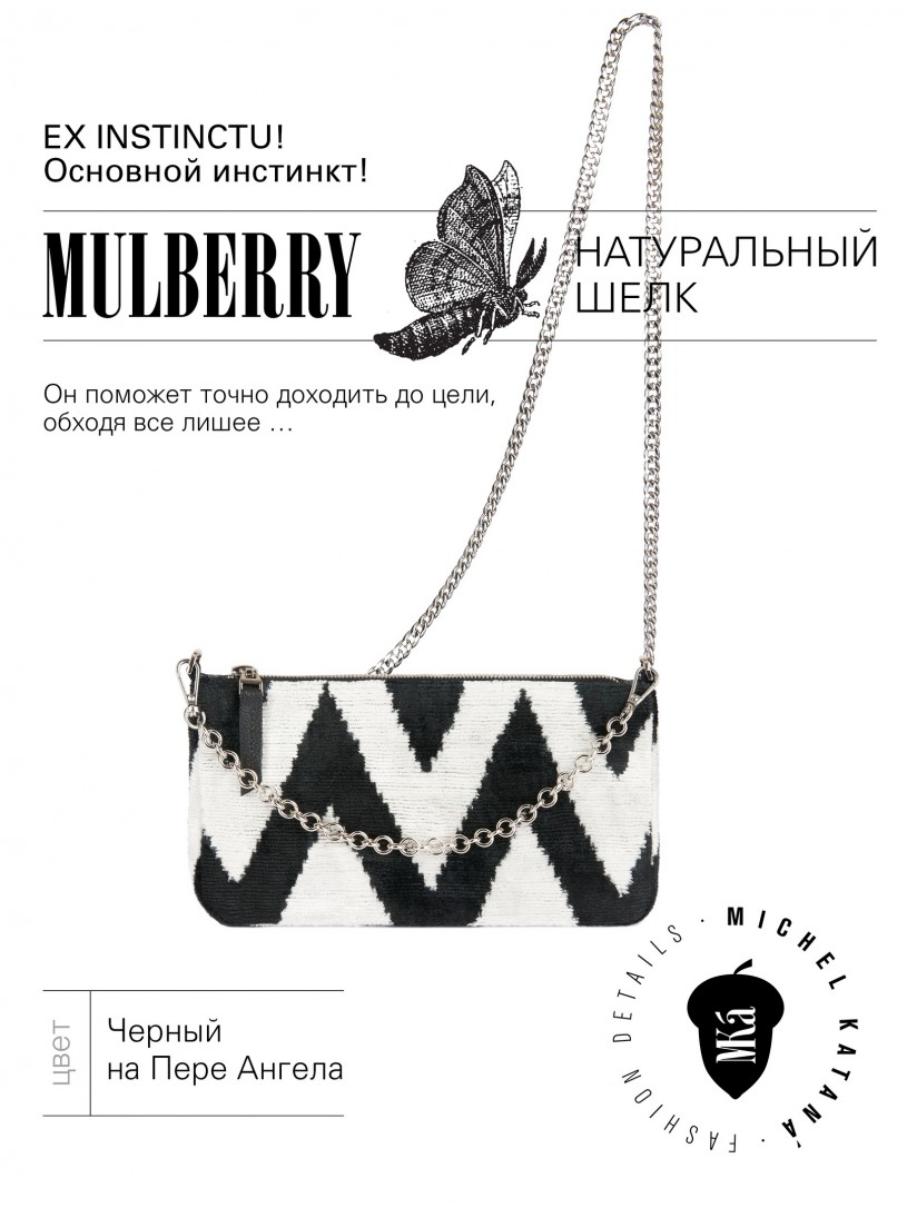 Натуральный шелк, сотканная вручную по традиционной и аутентичной технологии ручного ткачества в Ферганской долине Узбекистана (Маргилан) ткань Бахмаль. Из нитей шелка окрашенных также вручную натуральными красителями. Ткут ее именно крафтово, в домашних условиях на традиционных крафтовых ткацких станках. Нити шелка вотканы в структуру из нитей хлопка, в весовых пропорциях приблизительно 80/20% Шелк/Хлопок. Ткань невероятно долговечна, красива, мягка, и в то же время прочна... по сути "неубиваемая" ткань. Именно на перекрестке этого традиционного характерного, и эстетики дизайнерского восприятия от Michel Kataná и появилась эта коллекция сумок и аксессуаров к ним, на дальнейший пошив которых уходит еще не менее 72 часов работы мастеров для каждой.