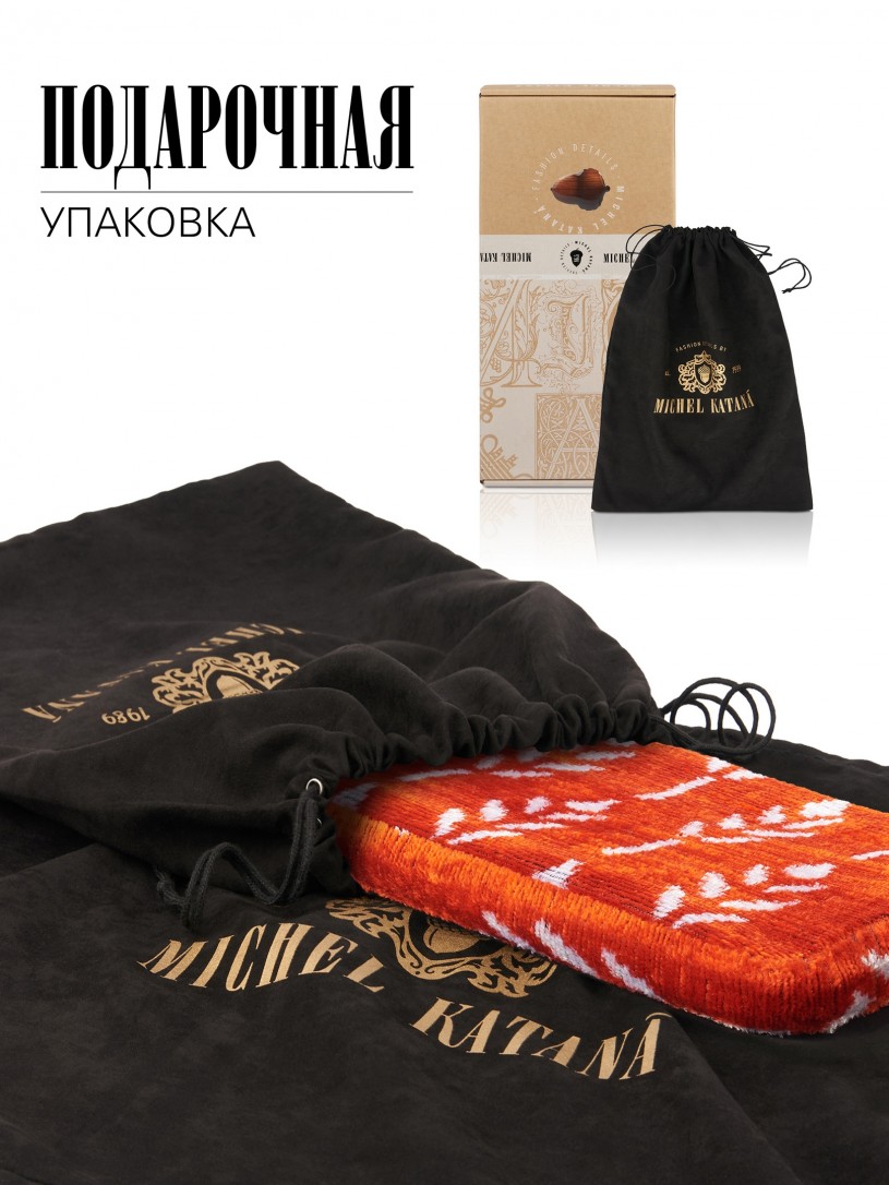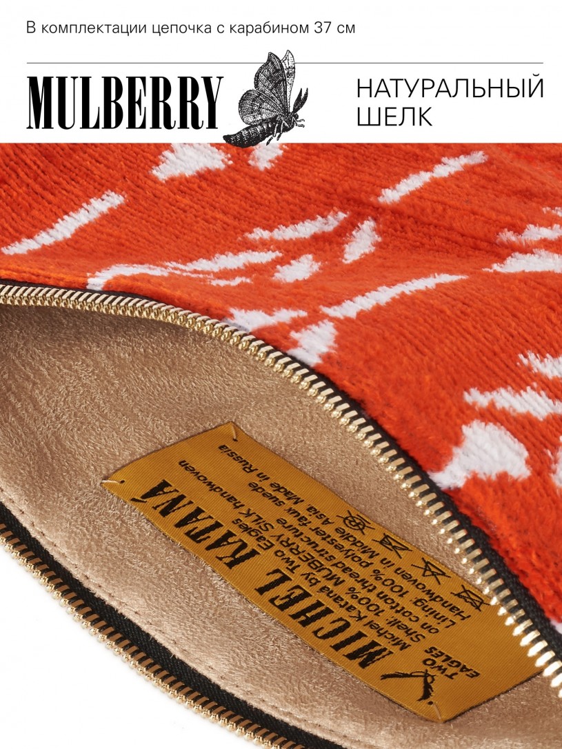 Натуральный шелк, сотканная вручную по традиционной и аутентичной технологии ручного ткачества в Ферганской долине Узбекистана (Маргилан) ткань Бахмаль. Из нитей шелка окрашенных также вручную натуральными красителями. Ткут ее именно крафтово, в домашних условиях на традиционных крафтовых ткацких станках. Нити шелка вотканы в структуру из нитей хлопка, в весовых пропорциях приблизительно 80/20% Шелк/Хлопок. Ткань невероятно долговечна, красива, мягка, и в то же время прочна... по сути "неубиваемая" ткань. Именно на перекрестке этого традиционного характерного, и эстетики дизайнерского восприятия от Michel Kataná и появилась эта коллекция сумок и аксессуаров к ним, на дальнейший пошив которых уходит еще не менее 72 часов работы мастеров для каждой.