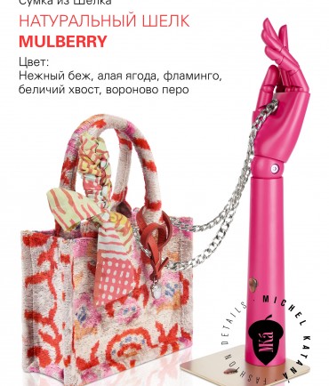 Натуральный шелк, сотканная вручную по традиционной и аутентичной технологии ручного ткачества в Ферганской долине Узбекистана (Маргилан) ткань Бахмаль. Из нитей шелка окрашенных также вручную натуральными красителями. Ткут ее именно крафтово, в домашних условиях на традиционных крафтовых ткацких станках. Нити шелка вотканы в структуру из нитей хлопка, в весовых пропорциях приблизительно 80/20% Шелк/Хлопок. Ткань невероятно долговечна, красива, мягка, и в то же время прочна... по сути "неубиваемая" ткань. Именно на перекрестке этого традиционного характерного, и эстетики дизайнерского восприятия от Michel Kataná и появилась эта коллекция сумок и аксессуаров к ним, на дальнейший пошив которых уходит еще не менее 72 часов работы мастеров для каждой.