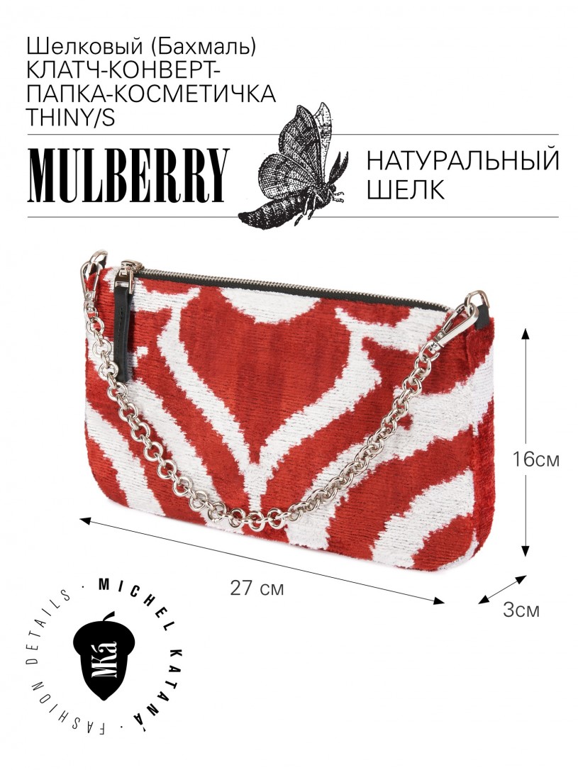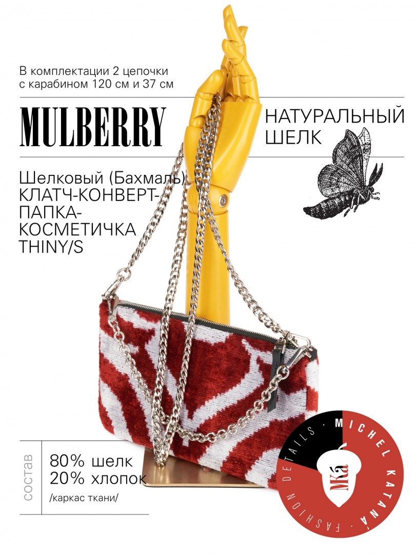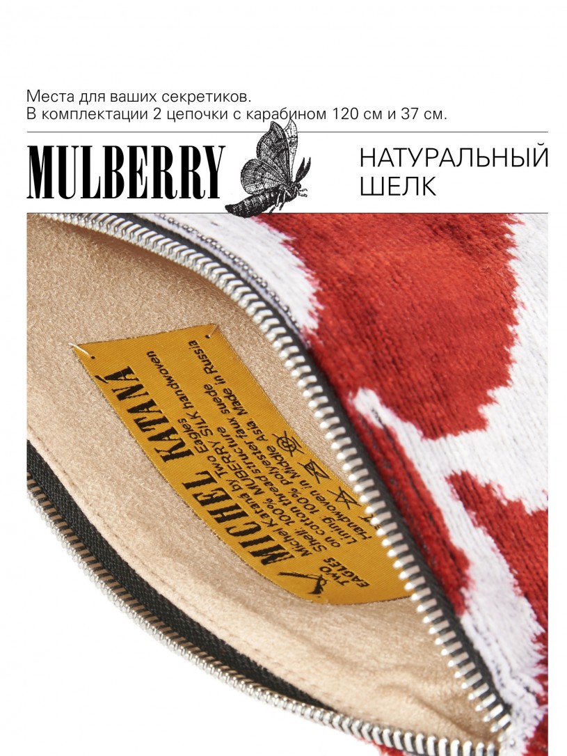 Натуральный шелк, сотканная вручную по традиционной и аутентичной технологии ручного ткачества в Ферганской долине Узбекистана (Маргилан) ткань Бахмаль. Из нитей шелка окрашенных также вручную натуральными красителями. Ткут ее именно крафтово, в домашних условиях на традиционных крафтовых ткацких станках. Нити шелка вотканы в структуру из нитей хлопка, в весовых пропорциях приблизительно 80/20% Шелк/Хлопок. Ткань невероятно долговечна, красива, мягка, и в то же время прочна... по сути "неубиваемая" ткань. Именно на перекрестке этого традиционного характерного, и эстетики дизайнерского восприятия от Michel Kataná и появилась эта коллекция сумок и аксессуаров к ним, на дальнейший пошив которых уходит еще не менее 72 часов работы мастеров для каждой.