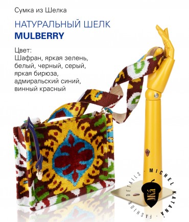 Натуральный шелк, сотканная вручную по традиционной и аутентичной технологии ручного ткачества в Ферганской долине Узбекистана (Маргилан) ткань Бахмаль. Из нитей шелка окрашенных также вручную натуральными красителями. Ткут ее именно крафтово, в домашних условиях на традиционных крафтовых ткацких станках. Нити шелка вотканы в структуру из нитей хлопка, в весовых пропорциях приблизительно 80/20% Шелк/Хлопок. Ткань невероятно долговечна, красива, мягка, и в то же время прочна... по сути "неубиваемая" ткань. Именно на перекрестке этого традиционного характерного, и эстетики дизайнерского восприятия от Michel Kataná и появилась эта коллекция сумок и аксессуаров к ним, на дальнейший пошив которых уходит еще не менее 72 часов работы мастеров для каждой.