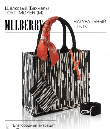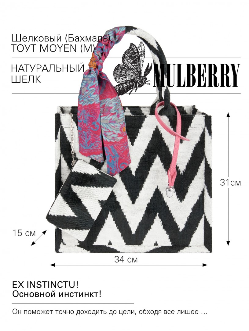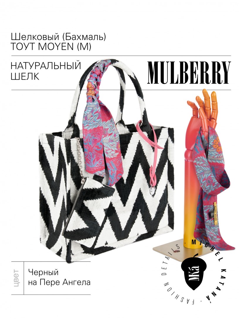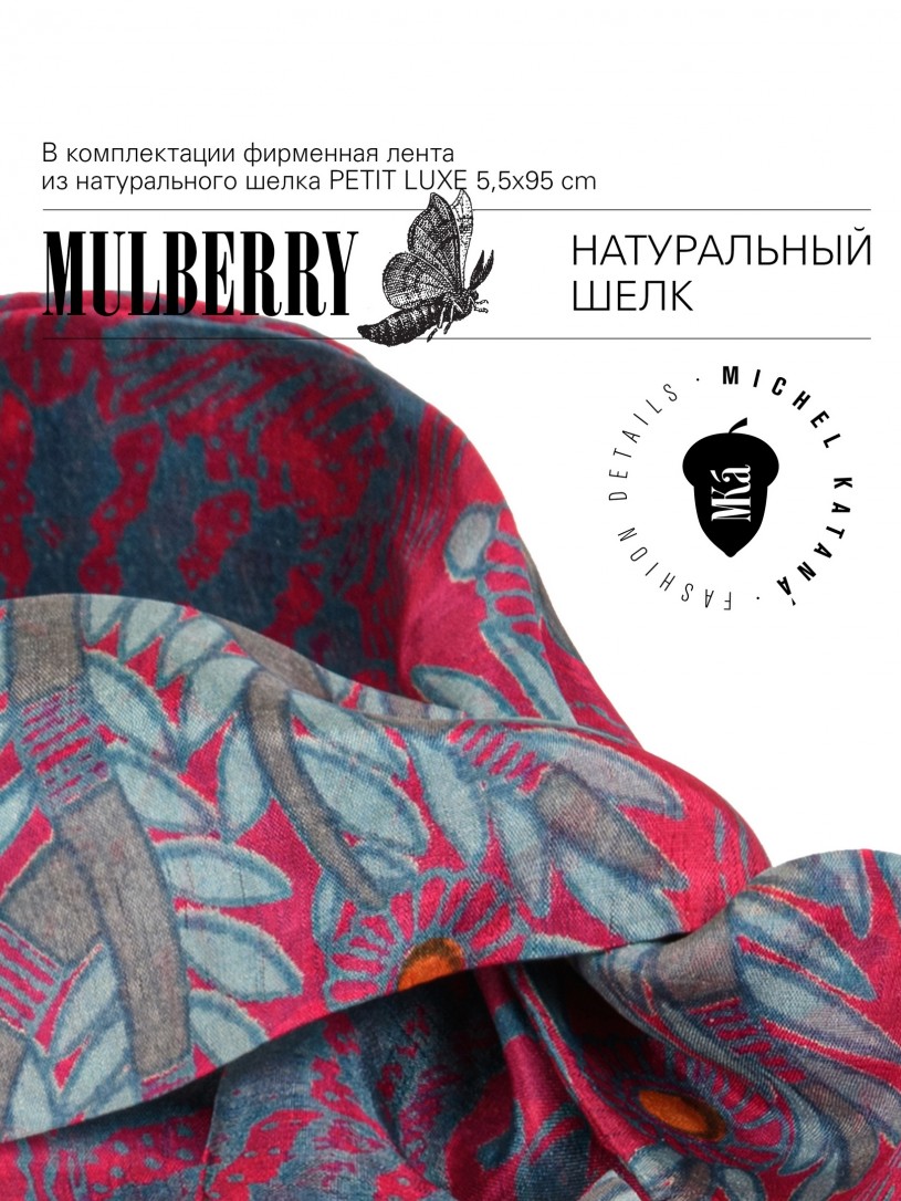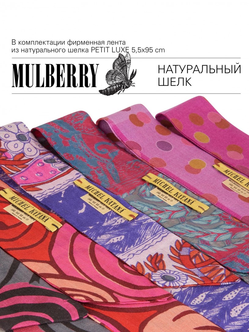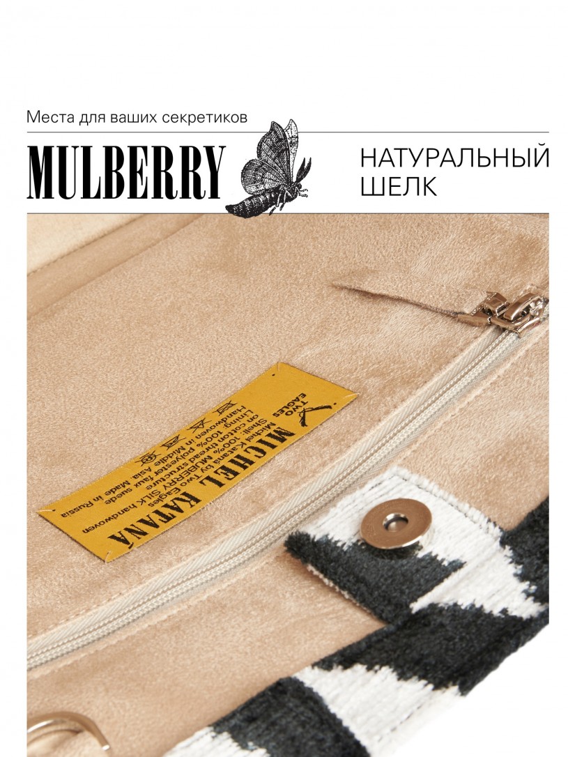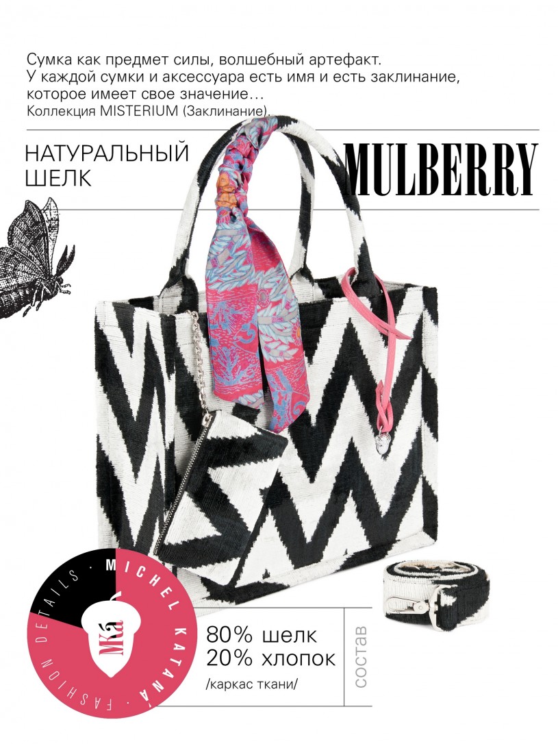Натуральный шелк, сотканная вручную по традиционной и аутентичной технологии ручного ткачества в Ферганской долине Узбекистана (Маргилан) ткань Бахмаль. Из нитей шелка окрашенных также вручную натуральными красителями. Ткут ее именно крафтово, в домашних условиях на традиционных крафтовых ткацких станках. Нити шелка вотканы в структуру из нитей хлопка, в весовых пропорциях приблизительно 80/20% Шелк/Хлопок. Ткань невероятно долговечна, красива, мягка, и в то же время прочна... по сути "неубиваемая" ткань. Именно на перекрестке этого традиционного характерного, и эстетики дизайнерского восприятия от Michel Kataná и появилась эта коллекция сумок и аксессуаров к ним, на дальнейший пошив которых уходит еще не менее 72 часов работы мастеров для каждой.