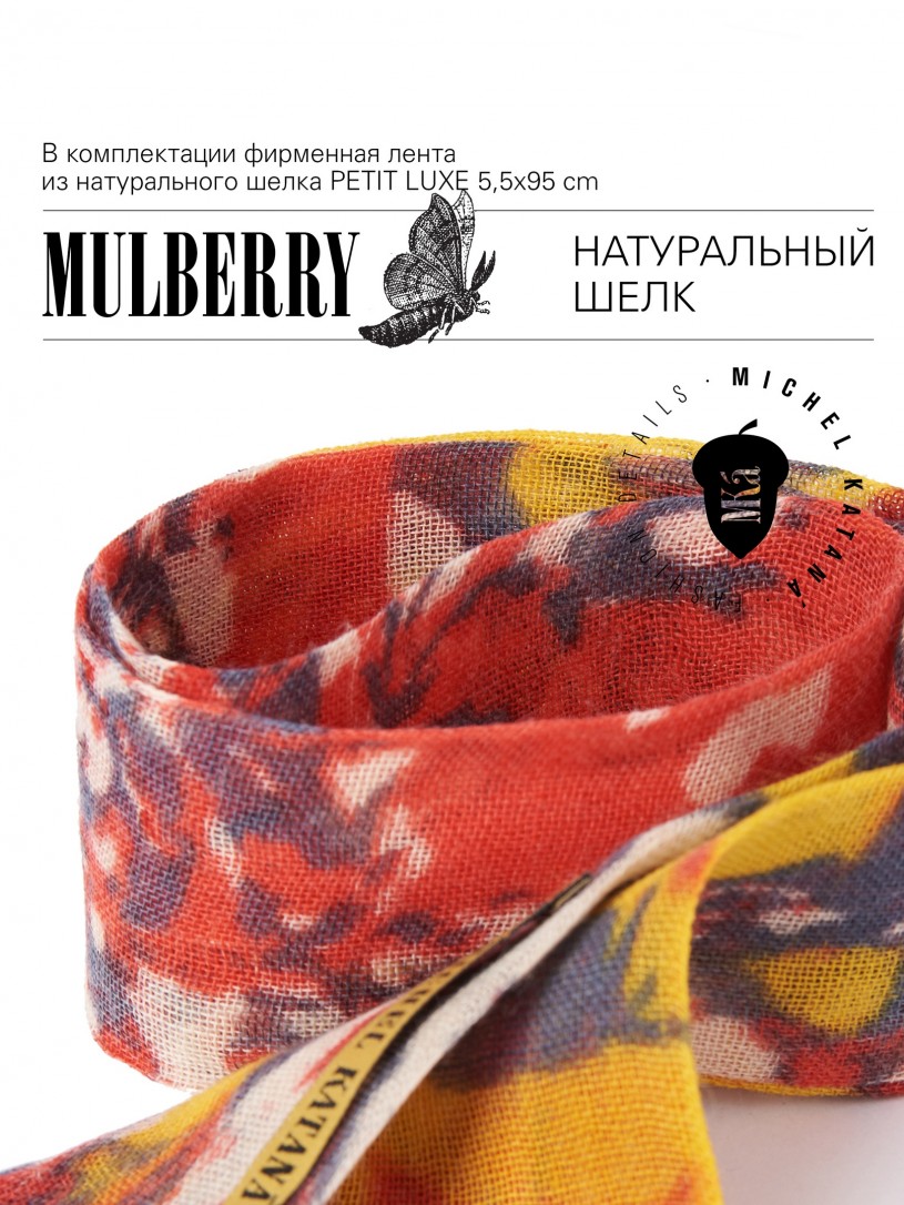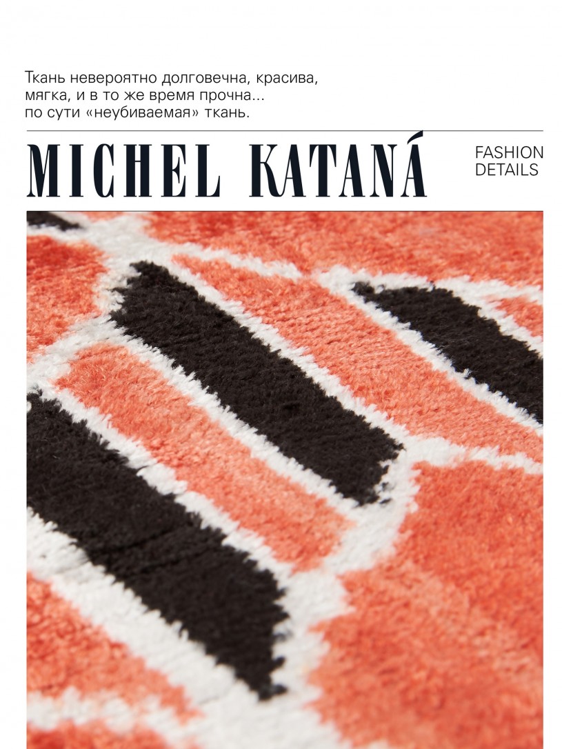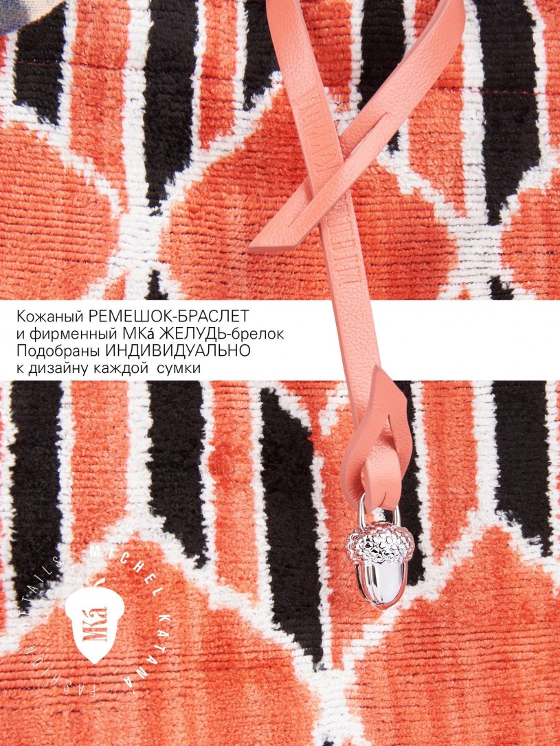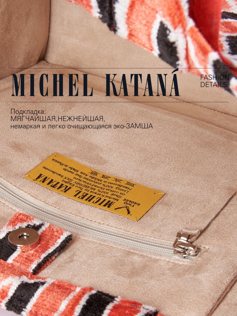 Натуральный шелк, сотканная вручную по традиционной и аутентичной технологии ручного ткачества в Ферганской долине Узбекистана (Маргилан) ткань Бахмаль. Из нитей шелка окрашенных также вручную натуральными красителями. Ткут ее именно крафтово, в домашних условиях на традиционных крафтовых ткацких станках. Нити шелка вотканы в структуру из нитей хлопка, в весовых пропорциях приблизительно 80/20% Шелк/Хлопок. Ткань невероятно долговечна, красива, мягка, и в то же время прочна... по сути "неубиваемая" ткань. Именно на перекрестке этого традиционного характерного, и эстетики дизайнерского восприятия от Michel Kataná и появилась эта коллекция сумок и аксессуаров к ним, на дальнейший пошив которых уходит еще не менее 72 часов работы мастеров для каждой.
