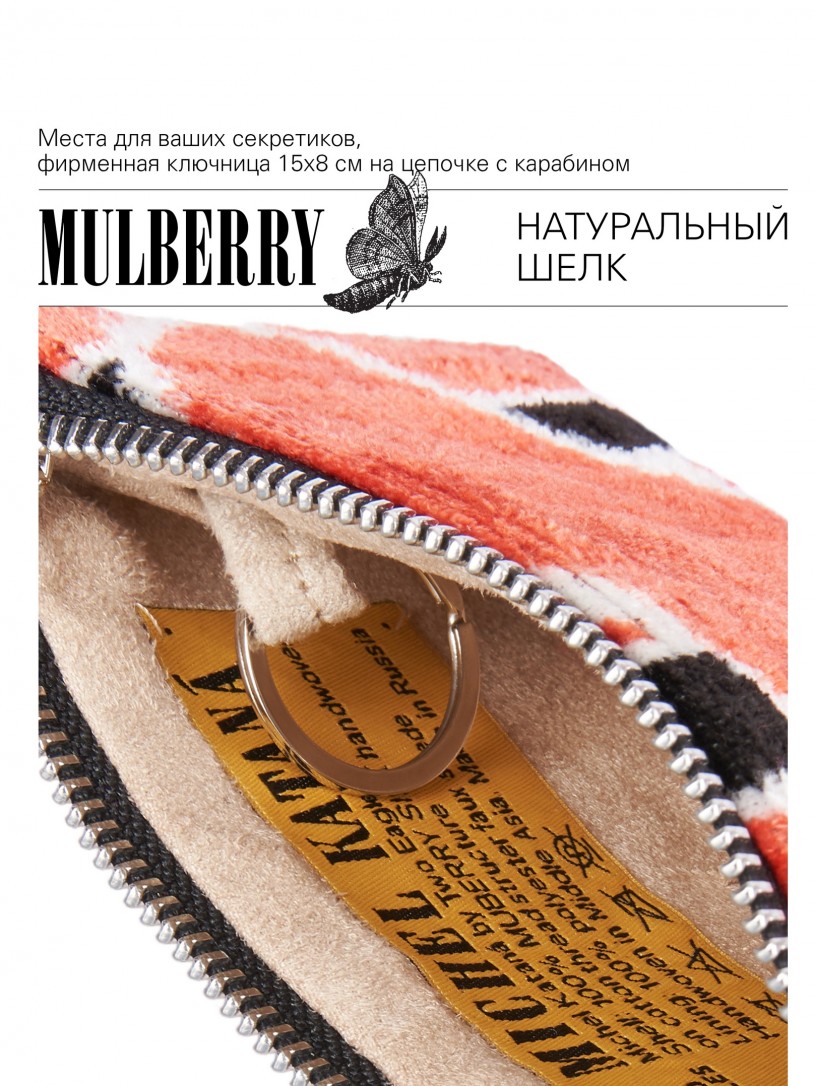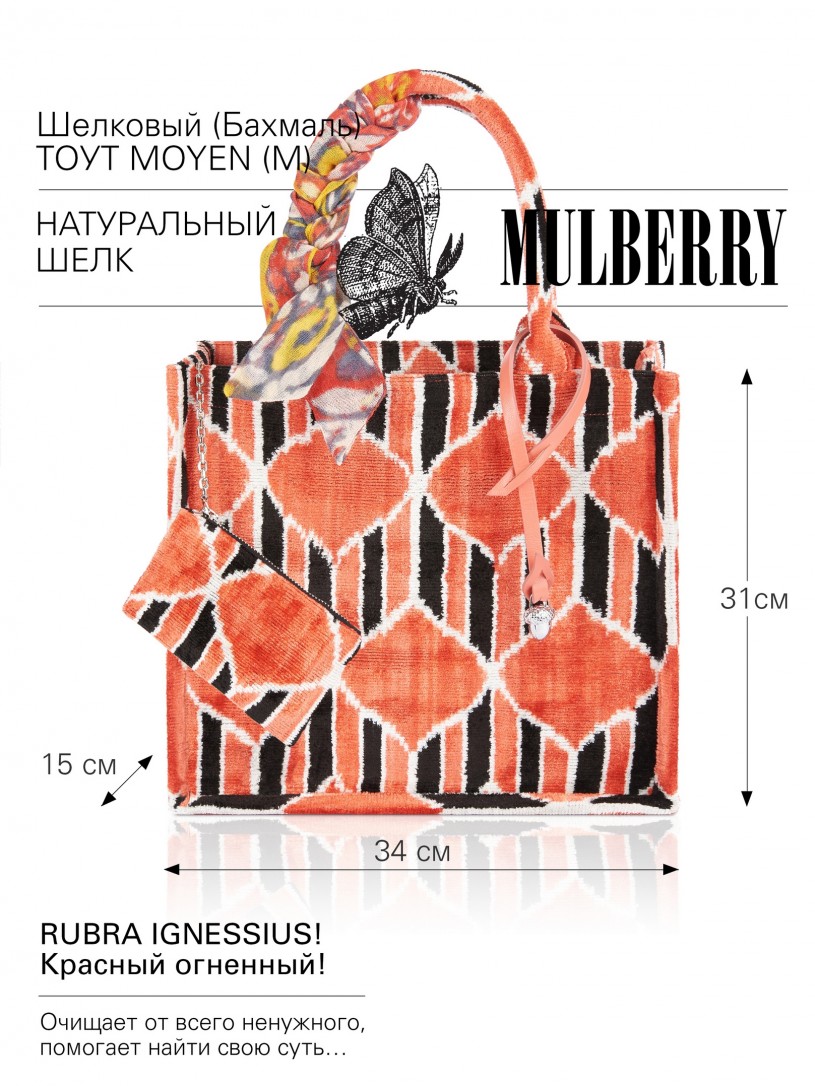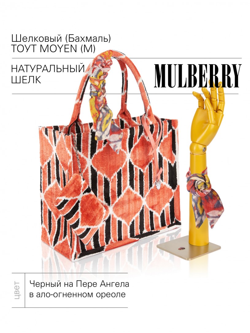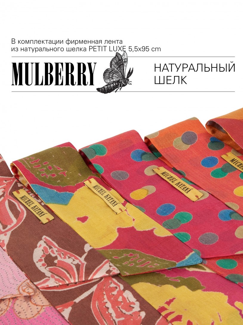 Натуральный шелк, сотканная вручную по традиционной и аутентичной технологии ручного ткачества в Ферганской долине Узбекистана (Маргилан) ткань Бахмаль. Из нитей шелка окрашенных также вручную натуральными красителями. Ткут ее именно крафтово, в домашних условиях на традиционных крафтовых ткацких станках. Нити шелка вотканы в структуру из нитей хлопка, в весовых пропорциях приблизительно 80/20% Шелк/Хлопок. Ткань невероятно долговечна, красива, мягка, и в то же время прочна... по сути "неубиваемая" ткань. Именно на перекрестке этого традиционного характерного, и эстетики дизайнерского восприятия от Michel Kataná и появилась эта коллекция сумок и аксессуаров к ним, на дальнейший пошив которых уходит еще не менее 72 часов работы мастеров для каждой.