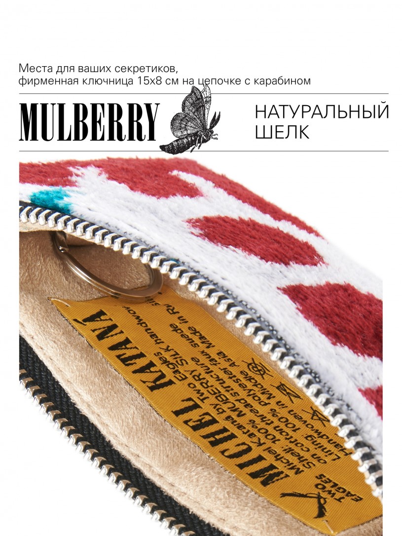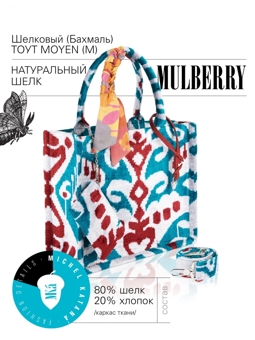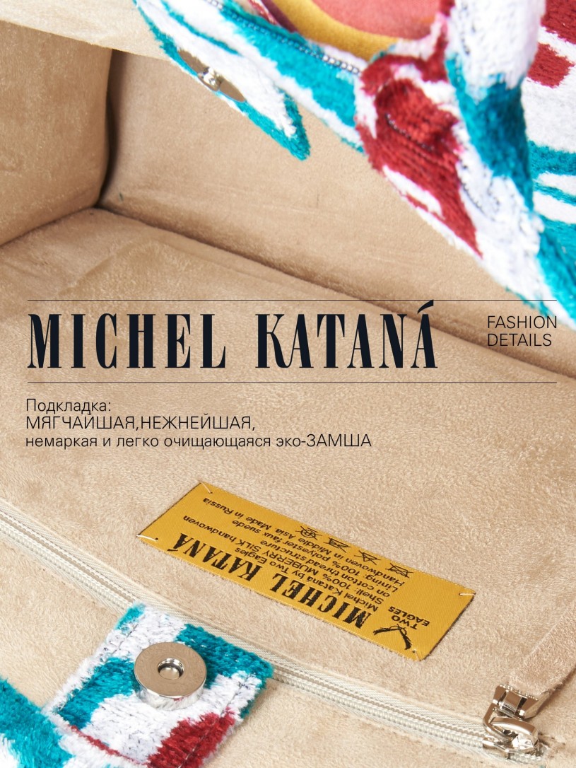 Натуральный шелк, сотканная вручную по традиционной и аутентичной технологии ручного ткачества в Ферганской долине Узбекистана (Маргилан) ткань Бахмаль. Из нитей шелка окрашенных также вручную натуральными красителями. Ткут ее именно крафтово, в домашних условиях на традиционных крафтовых ткацких станках. Нити шелка вотканы в структуру из нитей хлопка, в весовых пропорциях приблизительно 80/20% Шелк/Хлопок. Ткань невероятно долговечна, красива, мягка, и в то же время прочна... по сути "неубиваемая" ткань. Именно на перекрестке этого традиционного характерного, и эстетики дизайнерского восприятия от Michel Kataná и появилась эта коллекция сумок и аксессуаров к ним, на дальнейший пошив которых уходит еще не менее 72 часов работы мастеров для каждой.