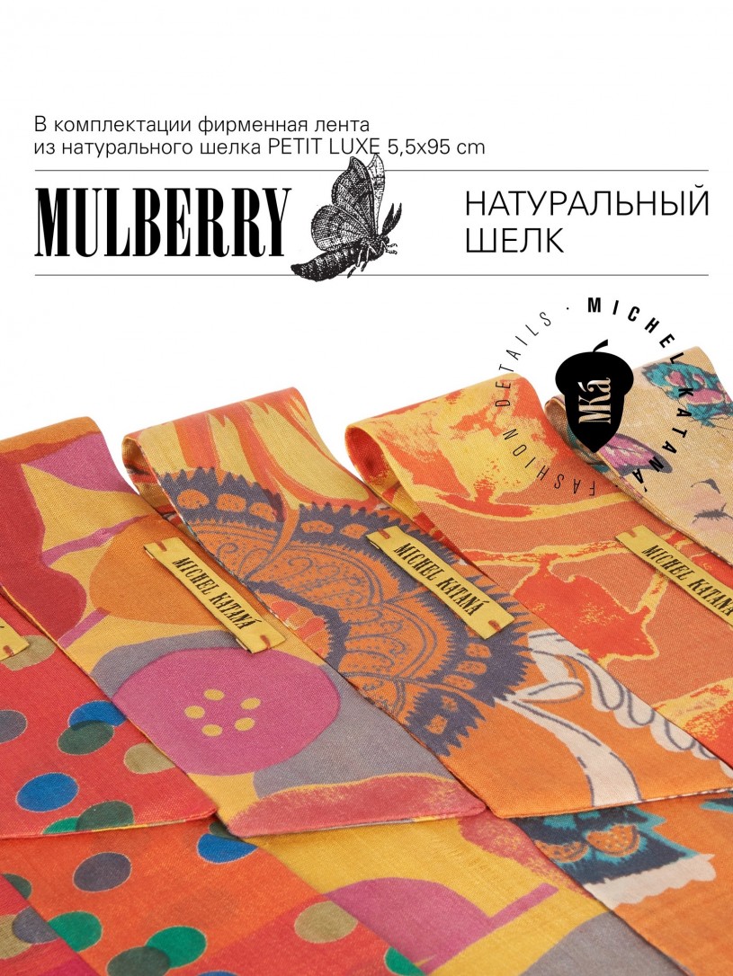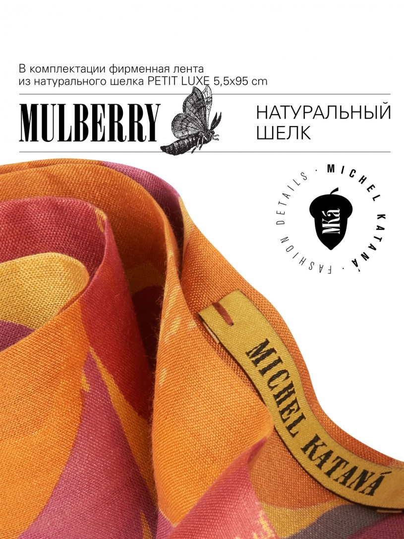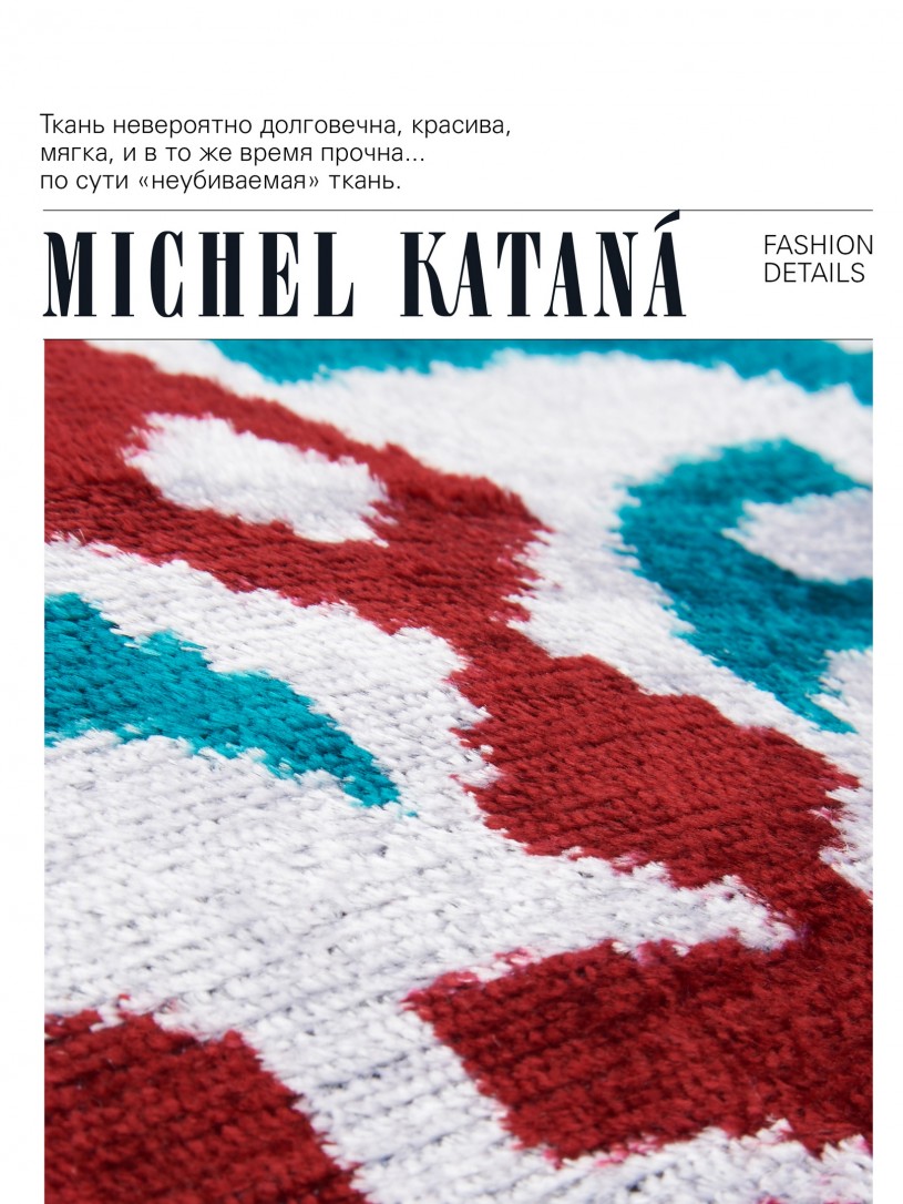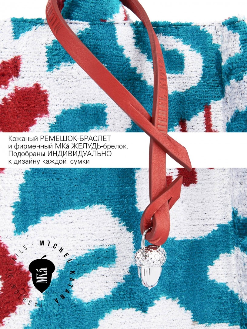 Натуральный шелк, сотканная вручную по традиционной и аутентичной технологии ручного ткачества в Ферганской долине Узбекистана (Маргилан) ткань Бахмаль. Из нитей шелка окрашенных также вручную натуральными красителями. Ткут ее именно крафтово, в домашних условиях на традиционных крафтовых ткацких станках. Нити шелка вотканы в структуру из нитей хлопка, в весовых пропорциях приблизительно 80/20% Шелк/Хлопок. Ткань невероятно долговечна, красива, мягка, и в то же время прочна... по сути "неубиваемая" ткань. Именно на перекрестке этого традиционного характерного, и эстетики дизайнерского восприятия от Michel Kataná и появилась эта коллекция сумок и аксессуаров к ним, на дальнейший пошив которых уходит еще не менее 72 часов работы мастеров для каждой.