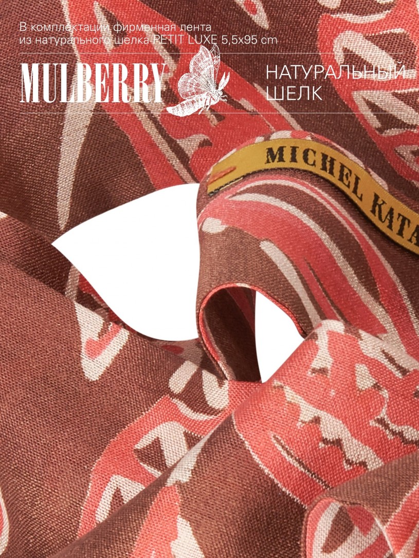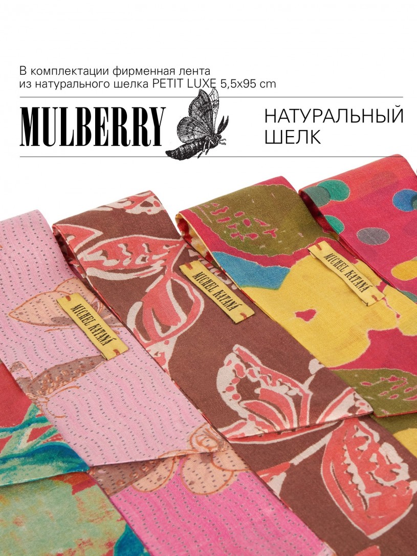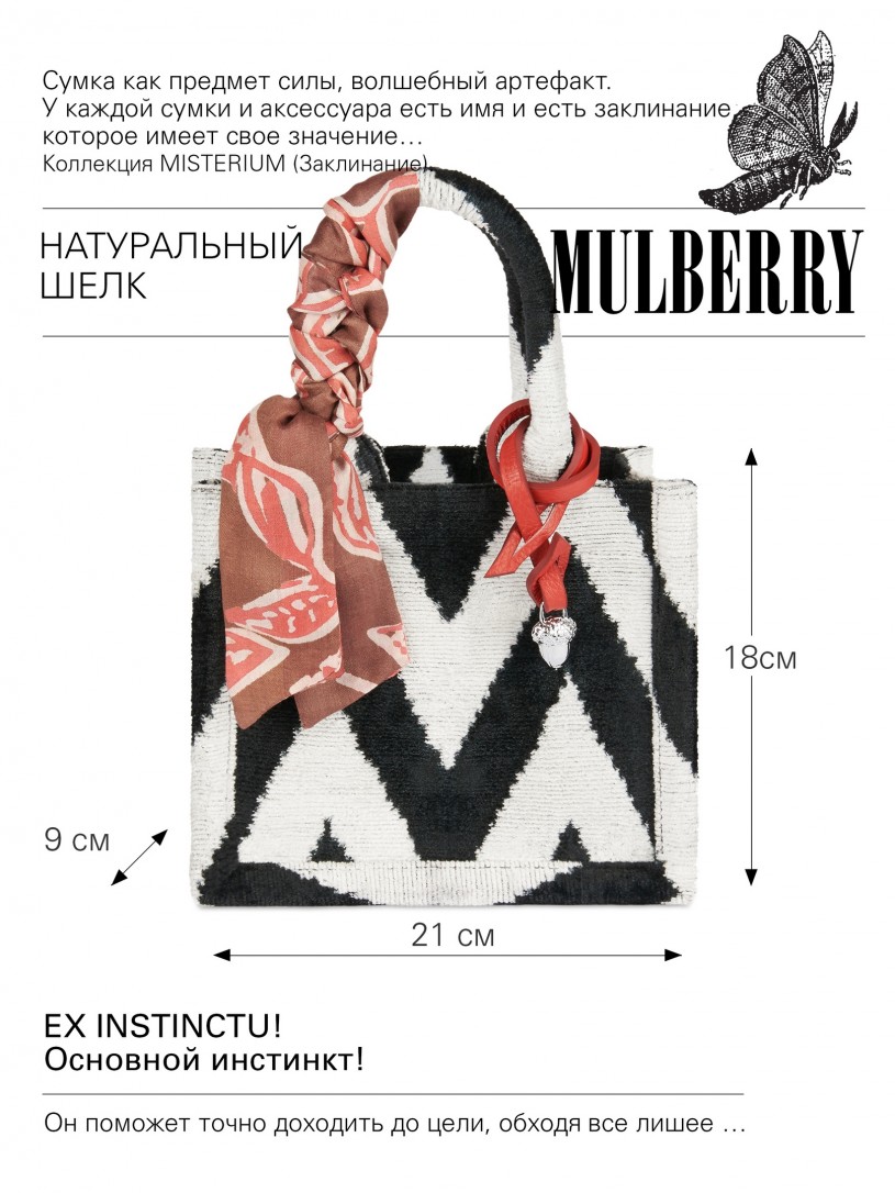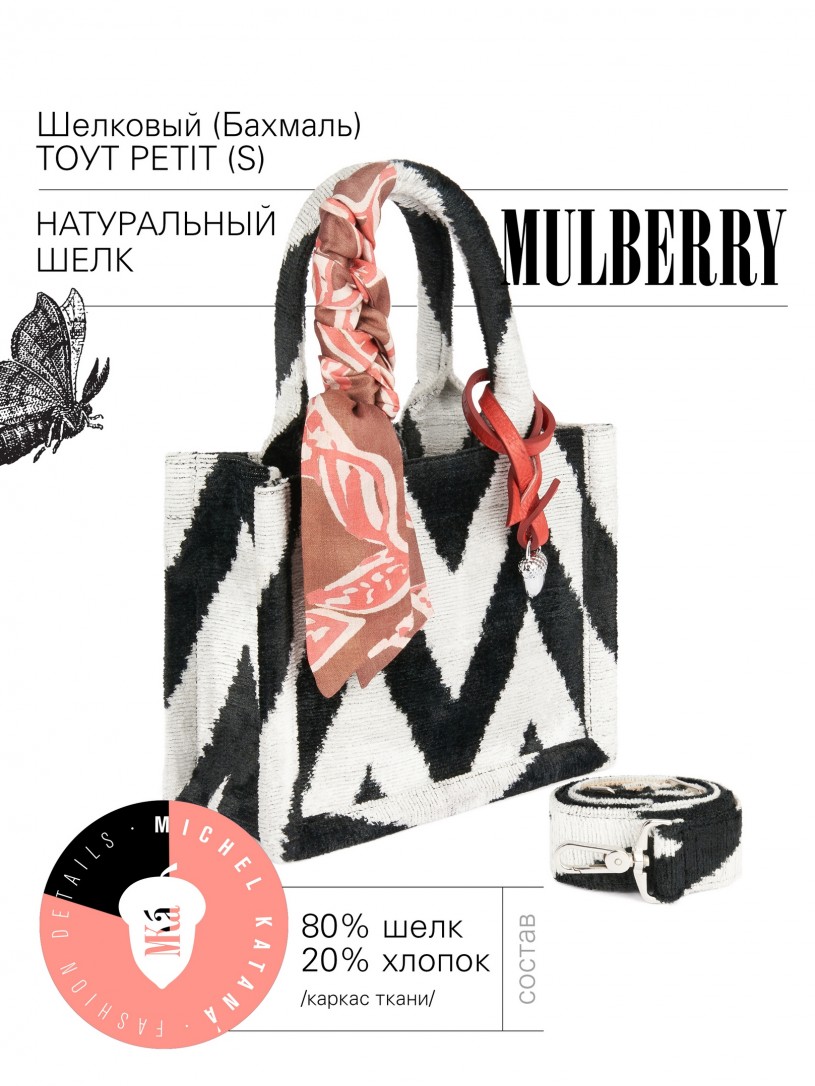 Натуральный шелк, сотканная вручную по традиционной и аутентичной технологии ручного ткачества в Ферганской долине Узбекистана (Маргилан) ткань Бахмаль. Из нитей шелка окрашенных также вручную натуральными красителями. Ткут ее именно крафтово, в домашних условиях на традиционных крафтовых ткацких станках. Нити шелка вотканы в структуру из нитей хлопка, в весовых пропорциях приблизительно 80/20% Шелк/Хлопок. Ткань невероятно долговечна, красива, мягка, и в то же время прочна... по сути "неубиваемая" ткань. Именно на перекрестке этого традиционного характерного, и эстетики дизайнерского восприятия от Michel Kataná и появилась эта коллекция сумок и аксессуаров к ним, на дальнейший пошив которых уходит еще не менее 72 часов работы мастеров для каждой.