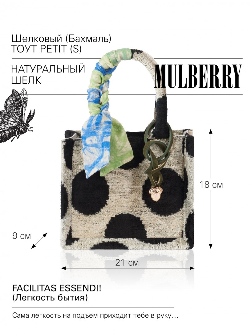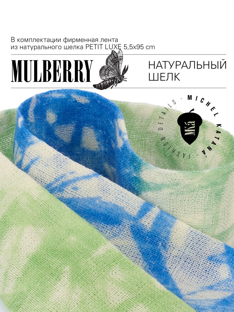 Натуральный шелк, сотканная вручную по традиционной и аутентичной технологии ручного ткачества в Ферганской долине Узбекистана (Маргилан) ткань Бахмаль. Из нитей шелка окрашенных также вручную натуральными красителями. Ткут ее именно крафтово, в домашних условиях на традиционных крафтовых ткацких станках. Нити шелка вотканы в структуру из нитей хлопка, в весовых пропорциях приблизительно 80/20% Шелк/Хлопок. Ткань невероятно долговечна, красива, мягка, и в то же время прочна... по сути "неубиваемая" ткань. Именно на перекрестке этого традиционного характерного, и эстетики дизайнерского восприятия от Michel Kataná и появилась эта коллекция сумок и аксессуаров к ним, на дальнейший пошив которых уходит еще не менее 72 часов работы мастеров для каждой.
