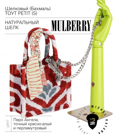 Натуральный шелк, сотканная вручную по традиционной и аутентичной технологии ручного ткачества в Ферганской долине Узбекистана (Маргилан) ткань Бахмаль. Из нитей шелка окрашенных также вручную натуральными красителями. Ткут ее именно крафтово, в домашних условиях на традиционных крафтовых ткацких станках. Нити шелка вотканы в структуру из нитей хлопка, в весовых пропорциях приблизительно 80/20% Шелк/Хлопок. Ткань невероятно долговечна, красива, мягка, и в то же время прочна... по сути "неубиваемая" ткань. Именно на перекрестке этого традиционного характерного, и эстетики дизайнерского восприятия от Michel Kataná и появилась эта коллекция сумок и аксессуаров к ним, на дальнейший пошив которых уходит еще не менее 72 часов работы мастеров для каждой.
