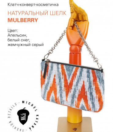 Натуральный шелк, сотканная вручную по традиционной и аутентичной технологии ручного ткачества в Ферганской долине Узбекистана (Маргилан) ткань Бахмаль. Из нитей шелка окрашенных также вручную натуральными красителями. Ткут ее именно крафтово, в домашних условиях на традиционных крафтовых ткацких станках. Нити шелка вотканы в структуру из нитей хлопка, в весовых пропорциях приблизительно 80/20% Шелк/Хлопок. Ткань невероятно долговечна, красива, мягка, и в то же время прочна... по сути "неубиваемая" ткань. Именно на перекрестке этого традиционного характерного, и эстетики дизайнерского восприятия от Michel Kataná и появилась эта коллекция сумок и аксессуаров к ним, на дальнейший пошив которых уходит еще не менее 72 часов работы мастеров для каждой.