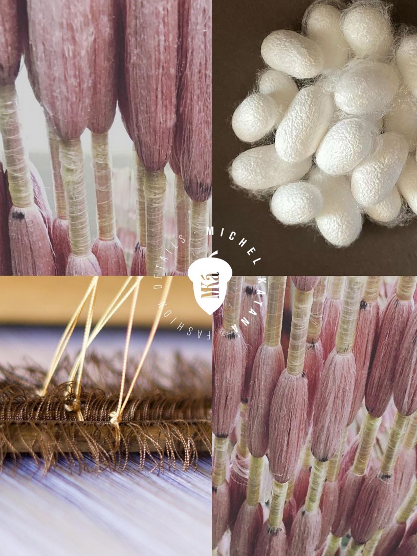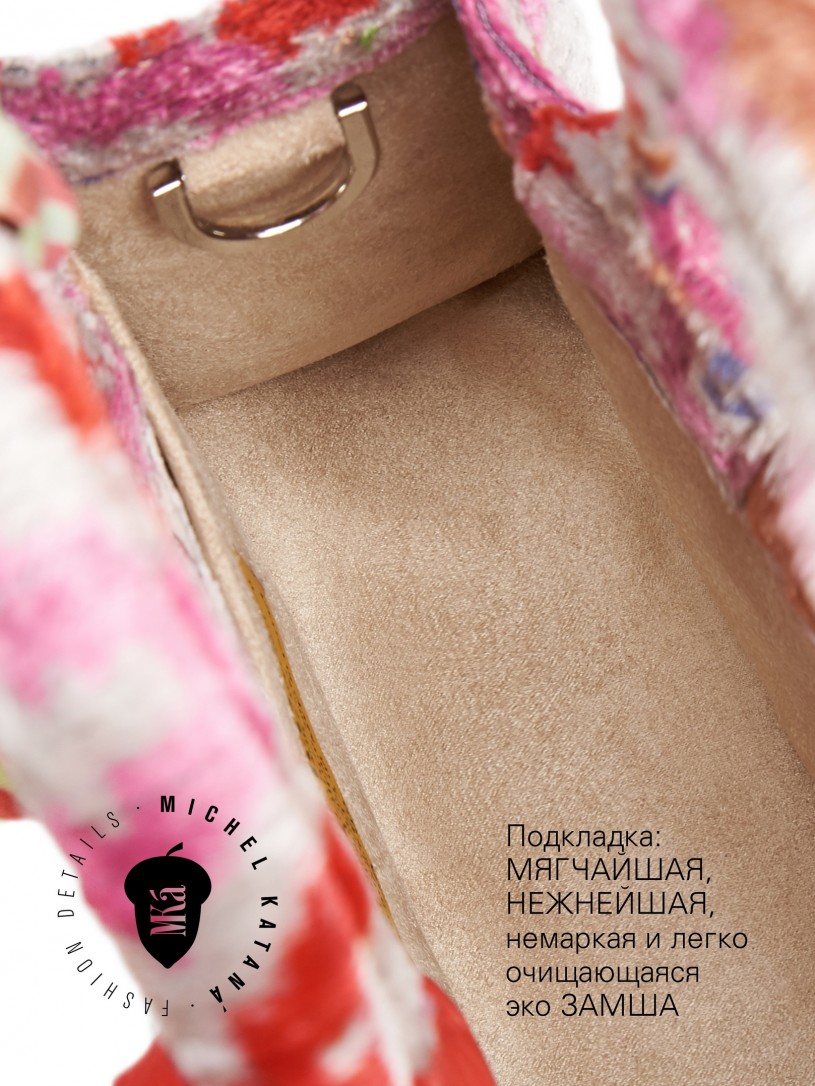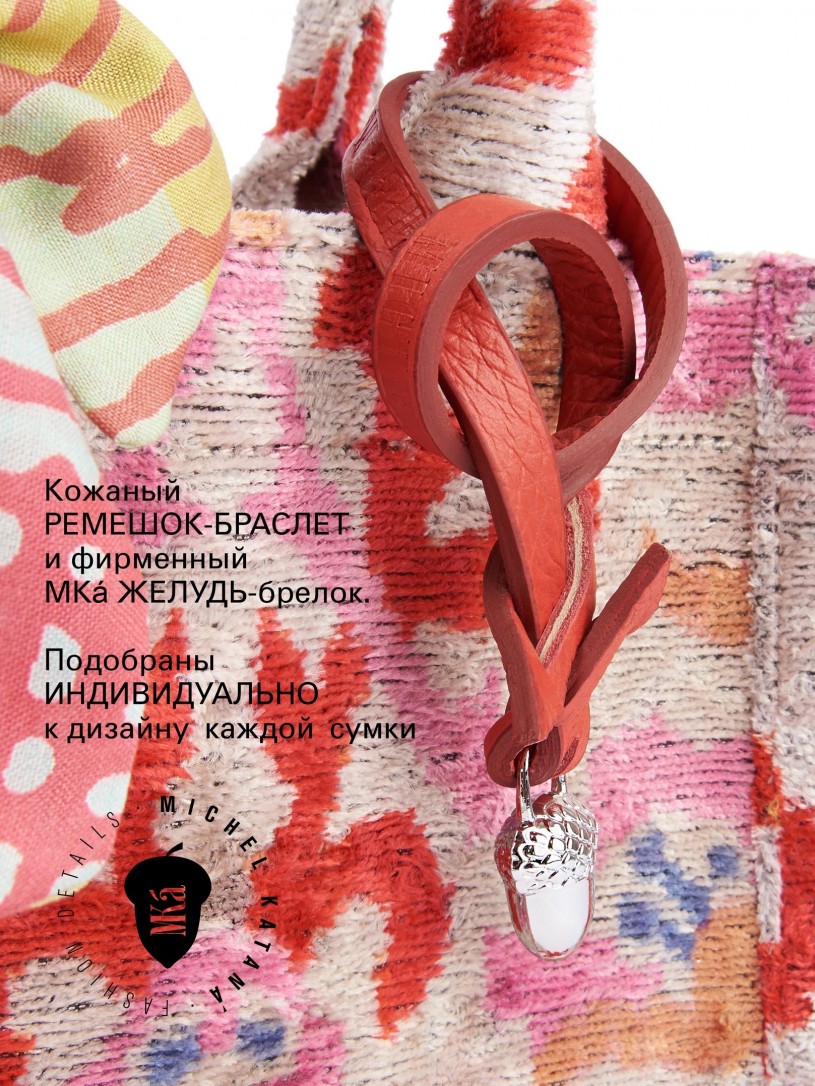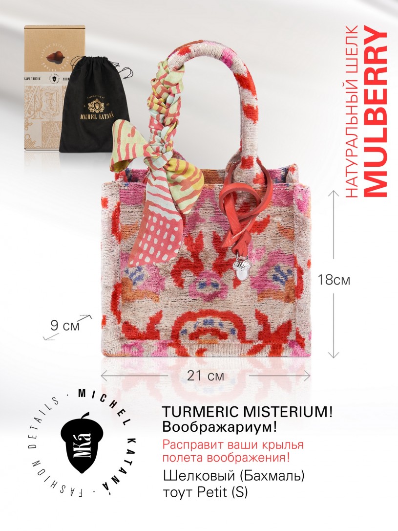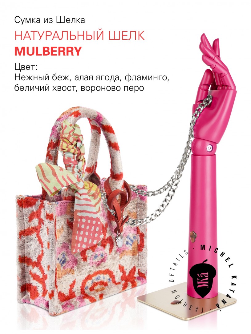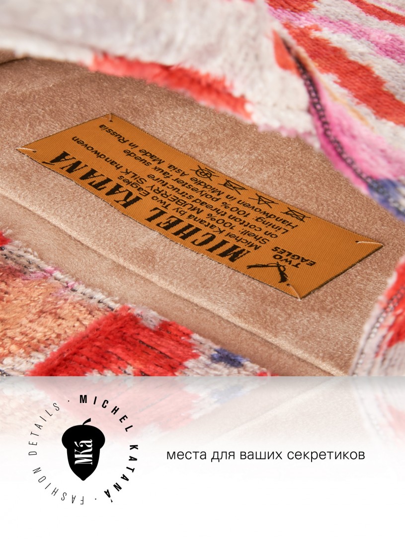 Натуральный шелк, сотканная вручную по традиционной и аутентичной технологии ручного ткачества в Ферганской долине Узбекистана (Маргилан) ткань Бахмаль. Из нитей шелка окрашенных также вручную натуральными красителями. Ткут ее именно крафтово, в домашних условиях на традиционных крафтовых ткацких станках. Нити шелка вотканы в структуру из нитей хлопка, в весовых пропорциях приблизительно 80/20% Шелк/Хлопок. Ткань невероятно долговечна, красива, мягка, и в то же время прочна... по сути "неубиваемая" ткань. Именно на перекрестке этого традиционного характерного, и эстетики дизайнерского восприятия от Michel Kataná и появилась эта коллекция сумок и аксессуаров к ним, на дальнейший пошив которых уходит еще не менее 72 часов работы мастеров для каждой.