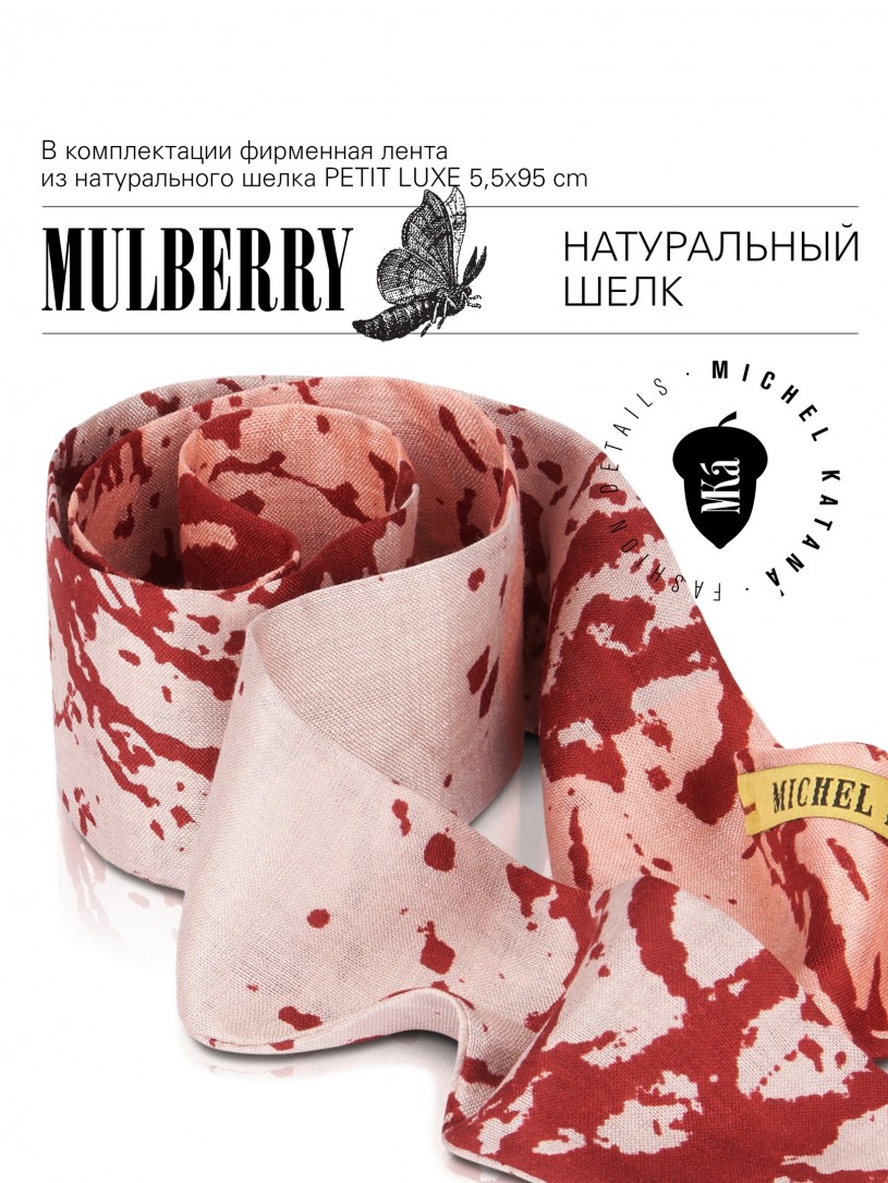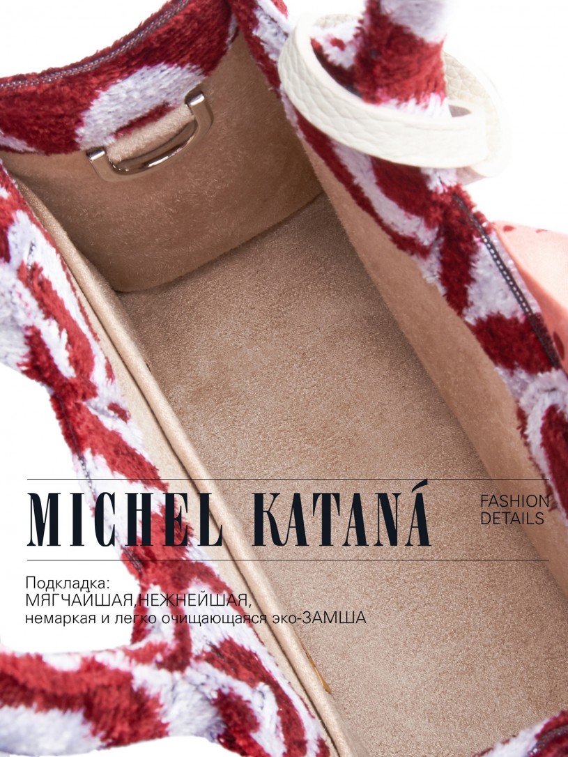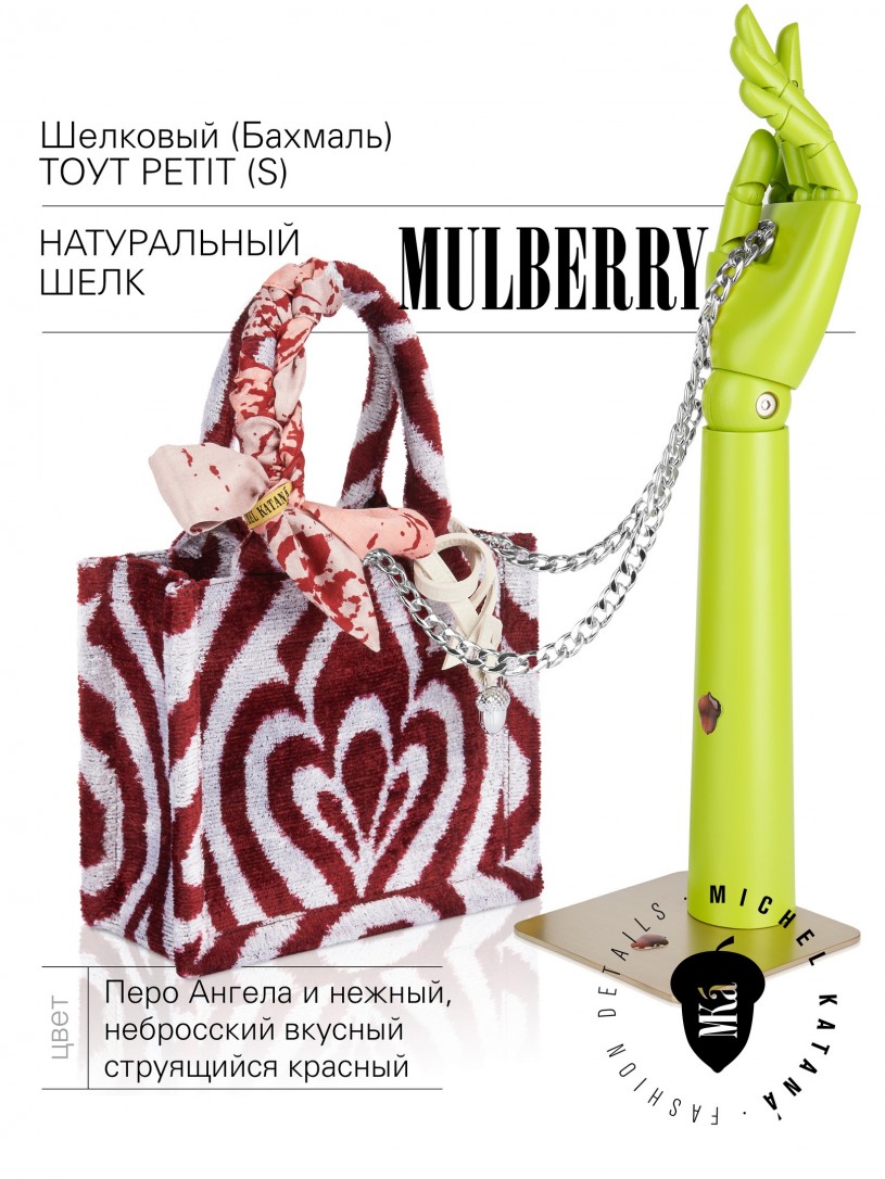 Натуральный шелк, сотканная вручную по традиционной и аутентичной технологии ручного ткачества в Ферганской долине Узбекистана (Маргилан) ткань Бахмаль. Из нитей шелка окрашенных также вручную натуральными красителями. Ткут ее именно крафтово, в домашних условиях на традиционных крафтовых ткацких станках. Нити шелка вотканы в структуру из нитей хлопка, в весовых пропорциях приблизительно 80/20% Шелк/Хлопок. Ткань невероятно долговечна, красива, мягка, и в то же время прочна... по сути "неубиваемая" ткань. Именно на перекрестке этого традиционного характерного, и эстетики дизайнерского восприятия от Michel Kataná и появилась эта коллекция сумок и аксессуаров к ним, на дальнейший пошив которых уходит еще не менее 72 часов работы мастеров для каждой.