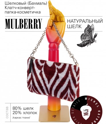 Натуральный шелк, сотканная вручную по традиционной и аутентичной технологии ручного ткачества в Ферганской долине Узбекистана (Маргилан) ткань Бахмаль. Из нитей шелка окрашенных также вручную натуральными красителями. Ткут ее именно крафтово, в домашних условиях на традиционных крафтовых ткацких станках. Нити шелка вотканы в структуру из нитей хлопка, в весовых пропорциях приблизительно 80/20% Шелк/Хлопок. Ткань невероятно долговечна, красива, мягка, и в то же время прочна... по сути "неубиваемая" ткань. Именно на перекрестке этого традиционного характерного, и эстетики дизайнерского восприятия от Michel Kataná и появилась эта коллекция сумок и аксессуаров к ним, на дальнейший пошив которых уходит еще не