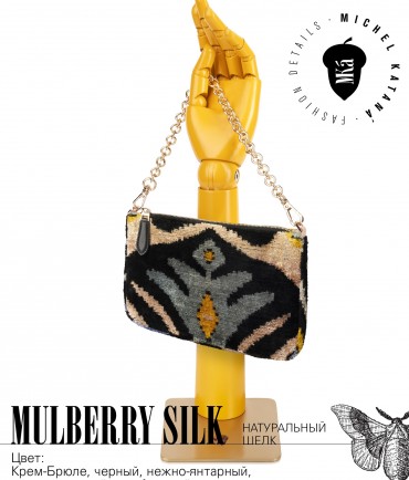 Натуральный шелк, сотканная вручную по традиционной и аутентичной технологии ручного ткачества в Ферганской долине Узбекистана (Маргилан) ткань Бахмаль. Из нитей шелка окрашенных также вручную натуральными красителями. Ткут ее именно крафтово, в домашних условиях на традиционных крафтовых ткацких станках. Нити шелка вотканы в структуру из нитей хлопка, в весовых пропорциях приблизительно 80/20% Шелк/Хлопок. Ткань невероятно долговечна, красива, мягка, и в то же время прочна... по сути "неубиваемая" ткань. Именно на перекрестке этого традиционного характерного, и эстетики дизайнерского восприятия от Michel Kataná и появилась эта коллекция сумок и аксессуаров к ним, на дальнейший пошив которых уходит еще не менее 72 часов работы мастеров для каждой.